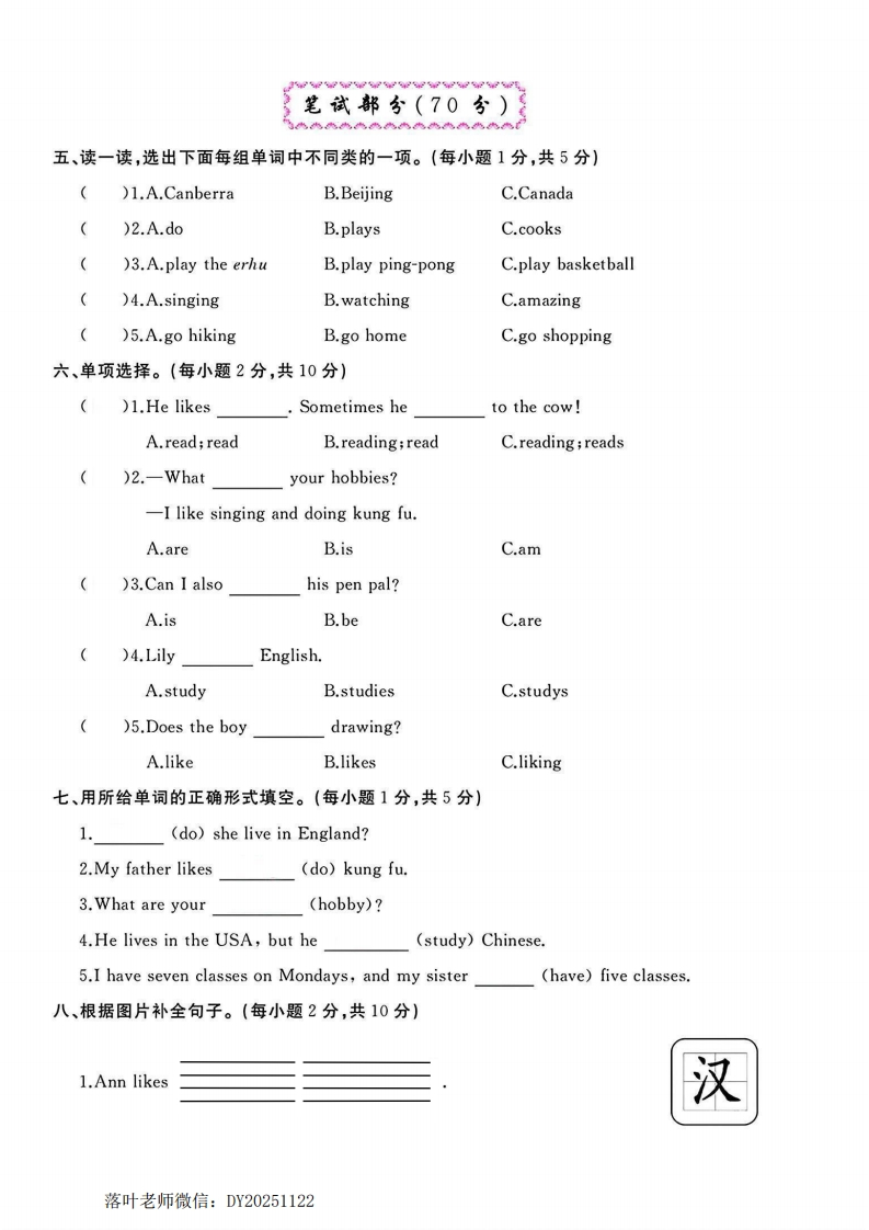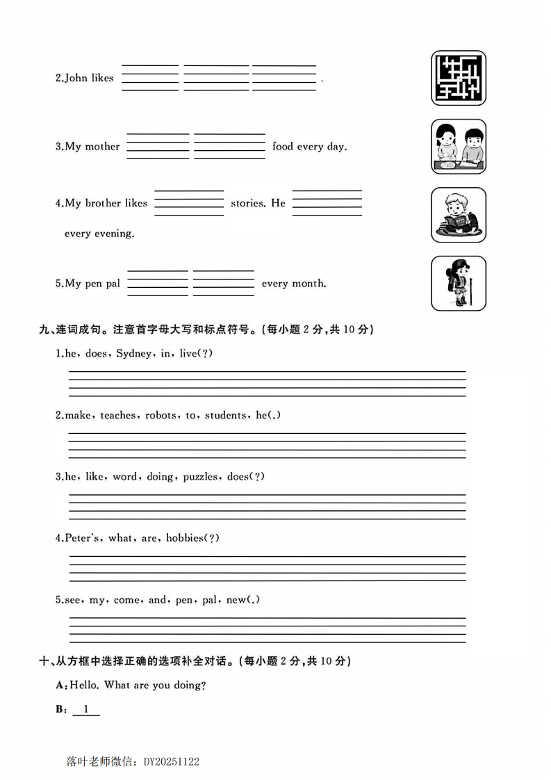 2025人教版六年级英语上册单元试卷第四单元测试卷时间:60分钟满分:100分题序三四五六七八九总分n得分听力部兮(30弥一、听句子,选出句子中所包含的选项,听2遍。(每小题1分,共5分)()1.A.teachesB.singsC.watches封()2.A.hobbyB.hospitalC.hobbies第()3.A.pen palB.best friendC.parents()4.A.does some thingsB.does kung fuC.does homework线)5.A.makingB.hikingC.taking二、听句子或对话,用1~5的序号给下列图片排序,听2遍。(每空1分,共5分)不三、听问句,选出正确的答语,听2遍。(每小题2分,共10分】要)1.A.I write my homework.B.I'm going to draw a picture.C.I'm writing an email.答)2.A.No,he doesn't.B.No,he can't.C.Yes,she does.毁)3.A.I'm going to take a trip.B.He likes playing football.C.I like singing and dancing.题)4.A.Cake,please!B.Yes,please.C.I don't like eating sweets.()5.A.No,you don't.B.Sure!C.No,thanks..四、听短文,用1~5的序号给下列句子排序,听2遍。(每空2分,共10分):)He does word puzzles every day.()He lives in the USA.)He likes singing and doing kung fu.)I have a new pen pal.His name is Mike.:)He also likes doing word puzzles.落叶老师微信:DY20251122