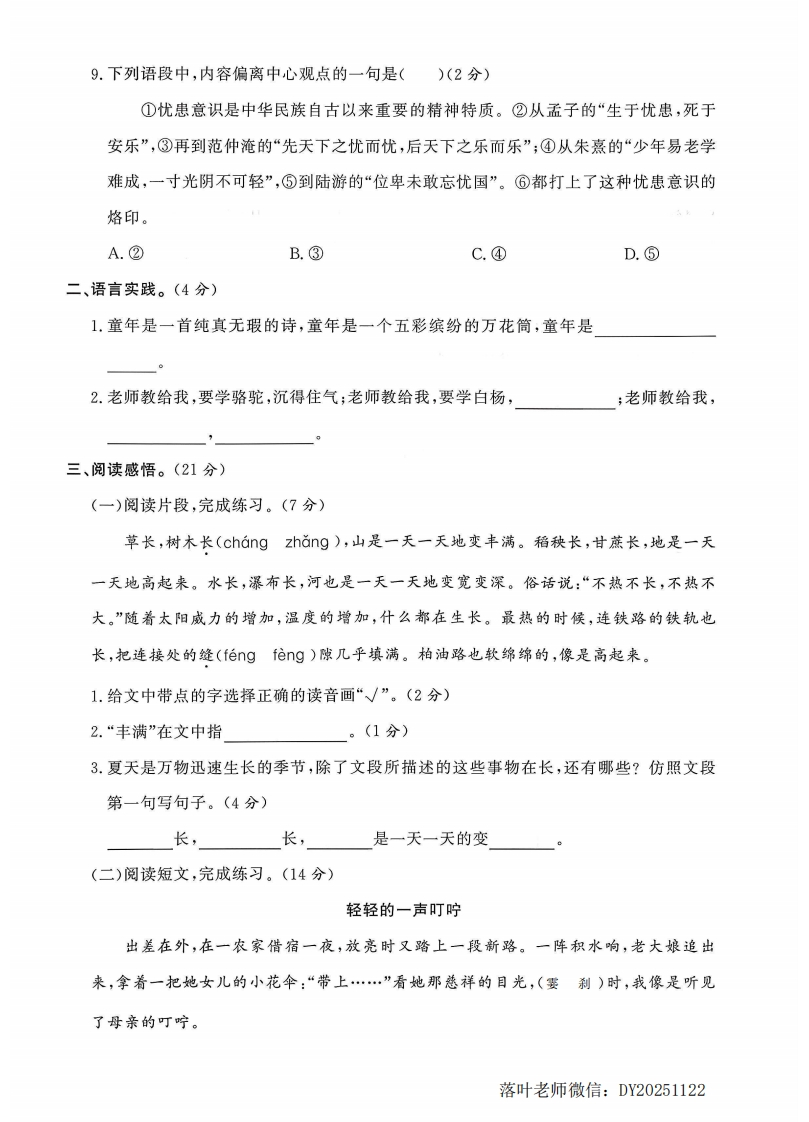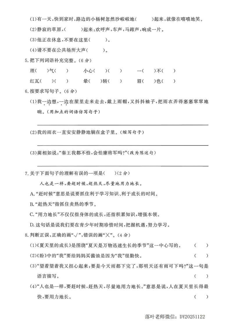 2025人教版六年级语文上册单元测试卷第五单元测试卷霸检测时间:90分钟满分:100分题序二三四总分得分一、积累运用。(45分)弥1.在加点字的正确读音下画“√”。(6分)绿蔓(man wan)菜畦(wàqi)铁轨(ya gui)封窸容(shuàisi)喧闹(uanXuàn)厚墩墩(dēndon)线2.读拼音,写字词(6分)内(1)一场雨过后,枝头长出了苞蕾,池塘边的石头feng xi里长满了鲜绿的ti童不xian田里的瓜蔓长高了一大截,gan zhe也长高了。要(2)小红shud着雨衣的xiùtng路fng跑着jiao rang答靠“下雨喽!下雨喽!”题3.根据读音写字组词。(9分)gui宝(衣(()花peng瓜()莲(斗(jiang()落石()油4.选词填空。(4分)时热闹喧闹喧哗吵闹落叶老师微信:DY20251122
