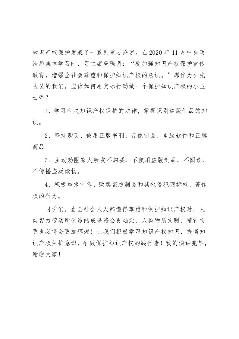 校长在国旗下讲话保护知识产权,从你我做起尊敬的老师、亲爱的同学们:大家早上好!今天我为大家演讲的题目是《保护知识产权,从你我做起!》。在学校里我们每天都在学习科学文化知识,那你知道什么是“知识产权”吗?在我们每个人的书包里,只要是正版书籍,打开书的扉页,我们都可以看到书的出版编号、版权申明等信息,这就是知识产权。同学们,那你知道知识产权有什么作用吗?相信大家都听说过景泰蓝吧,它是我国特有的工艺美术品,至今已有五百多年的历史,它以工艺精细、色泽晶莹、外表华丽而驰名中外。然而,就是这一中华文化之瑰宝,由于知识产权意识淡薄,竟被前来参观的外国客商偷取了其独有的生产工艺,令我国蒙受了不可估量的损失。同学们,这个沉痛的教训告诉了我们什么?那就是一一保护知识产权势在必行!亲爱的同学们,试想一下,如果你将来费尽心血取得的发明创造,被别人无偿的仿制或使用,那么你还会有积极性再去进行下一个发明创造吗?所以,知识产权制度可以保护发明创造者的合法权益,激励创新活动。知识产权中最主要的三种是著作权、专利权和商标权。党的十八大以来,习近平总书记就