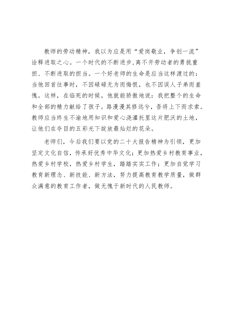 校长在教师例会上讲话,引用三个关键词钉钉子精神,奉献精神,劳动精神各位教师:当前全国上下都在认真学习党的二十大报告精神,其中提到了多个精神,在党的引领下,为了能把工作落到实处,今天的教师例会上,我选取了其中的钉钉子精神,奉献精神,劳动精神与在座的老师们分享交流,这三个关键词也是我们教师教育教学的价值追求和操作方法:一、钉钉子精神钉钉子是日常生活和工作中的一件小事,但是在习近平总书记眼中,钉钉子却蕴含着大道义、大哲学。钉钉子这件事情虽然再稀松平常不过,但是,钉钉子衍生出来的重要意义却是十分深刻的。钉钉子也属于技术活儿,如果位置钉歪了,抑或是用力不当,都不能把钉子钉牢固。在今天努力实现伟大“中国梦”的新长征路上,钉钉子精神就是我们的成事之要,我们的老师尤其需要发扬钉钉子精神,一步一个脚印、一锤一个深度地做好各项教育教学工作。发扬钉钉子精神,作为一名人民教师,首先就要立足实际,在明确发展方向的同时,也要找准自身存在的薄弱点,钉钉子讲究精而准,方向偏一尺,道路偏十丈,实现目标就遥遥无期。