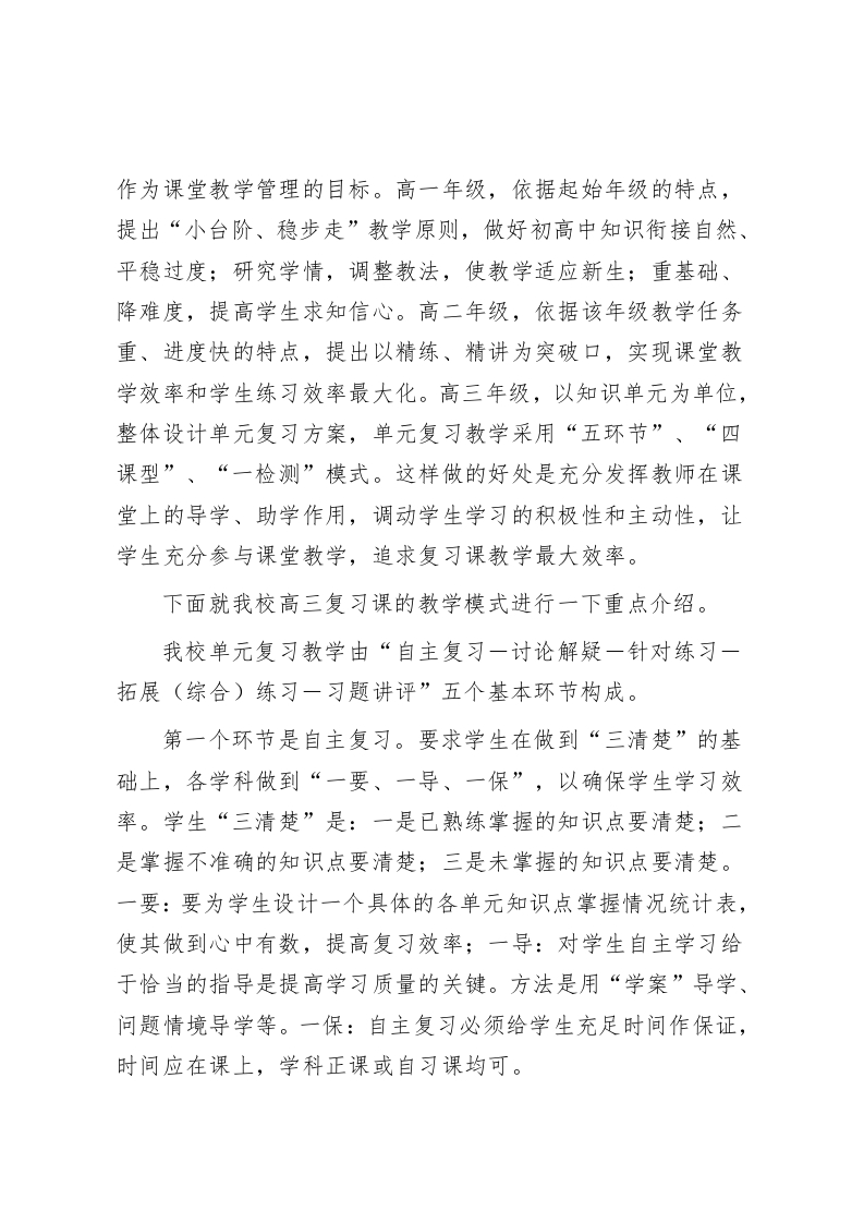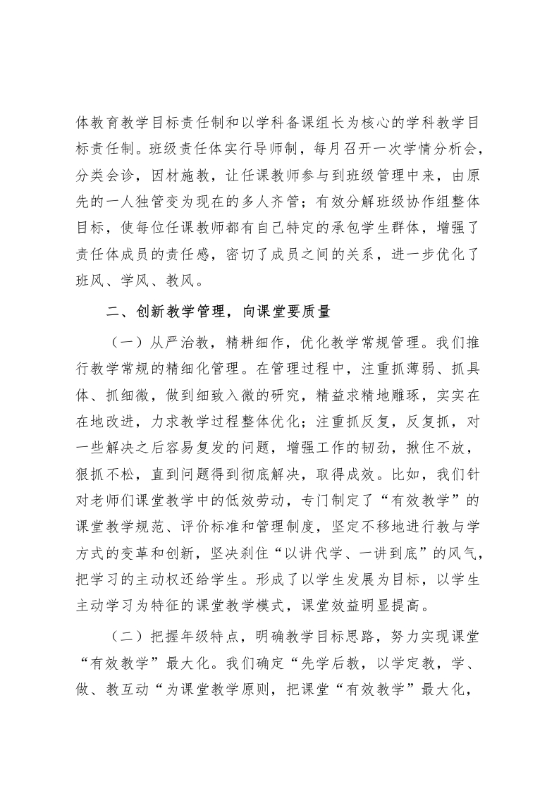 校长在教学经验交流上讲话用勤奋经营自己尊敬的各位领导、各位同仁:大家好!我校在上级教育主管部门的正确领导下,坚持“让每个人都能愉快地得到发展”的办学理念,进一步加强教育教学管理,深化教学改革,全校教职员工精诚团结,不懈努力,“用勤奋经营自己”,办学质量稳步提高。下面按上级要求就我校教育教学工作的一些做法向大家做一简要汇报。一、创新学校管理,提高管理效益我们立足学校实际,一改过去学校处室直接管理模式为年级模块化、扁平化的实体管理,实行学校统一领导下的年级主任负责制。由三位中层正职分别兼任三个年级的级主任,负责整个年级的教师选聘、日常考勤、常规考核、课务安排、教学研究、学生管理等工作。学科组长负责指导本年级的学科教学、集体备课等工作。学校各处室的职能变为指导、监督、协调、控制和评估。管理中心的下移,减少了管理环节,更好地适应了各个年级的差异性和特殊性,激活了年级的活力和创造性。另外,我校还注重打造团队精神,变“个人创优”为“集体创优”。改革教师工作评价机制,推行“捆绑式”考核奖惩制度。具体做法是:推行两个责任制,即以班主任为核心的整