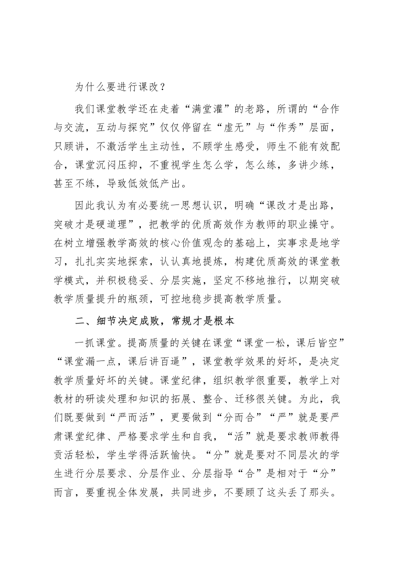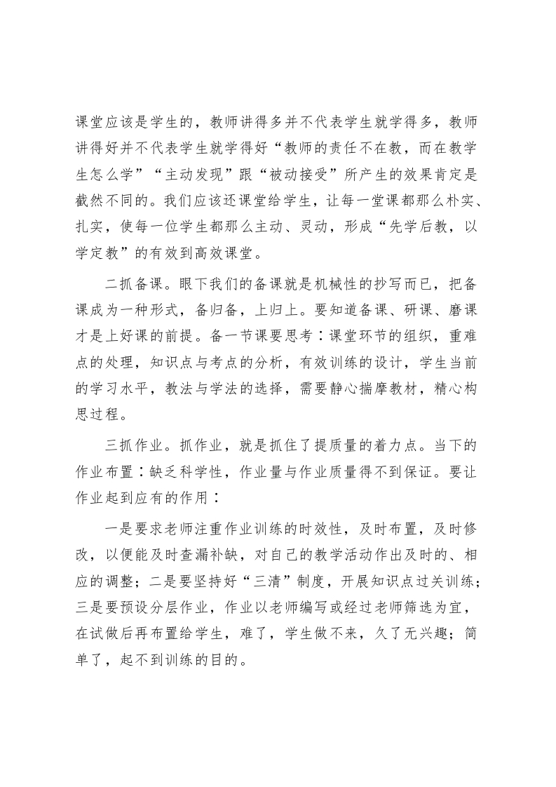 校长在教学质量推进会上讲话明确目标,从自身做起,从现在做起,从长远着眼,从细处着手,向管理要效益,向课堂要质量老师们:下午好教学是学校中心工作,教学质量是学校的生命线,建设高效课堂,提升教学质量是课改的根本目的。我们学校经过全体教师长期的不懈努力,教学品味已得到了很大的提升。但我们更应该看到,进一步提高教育教学质量是我校生存发展的关键。学校召开教学质量推进会,就是希望进一步强化质量意识,摸索总结推广提高教学质量的实招,也是希望各位众志成城实现我们期初提出的教学质量目标:保二(确保二、四两个年级综合成绩仍在全县村级完小第一的名次)争三(争取一年级综合成绩向在全县村级完小第一名冲刺,实现我校有三个年级综合成绩在全县村级完小第一目标)进十五(力求所有检测学科都进入在全县村级完小前十五的名次)。开质量推进会不仅是摆困难,更重要的是采用什么有效的措施怎样克服困难。我不是给大家作报告,而是结合个人在教学中的感受,谈四点体会:一、思想决定行动,课改才是出路