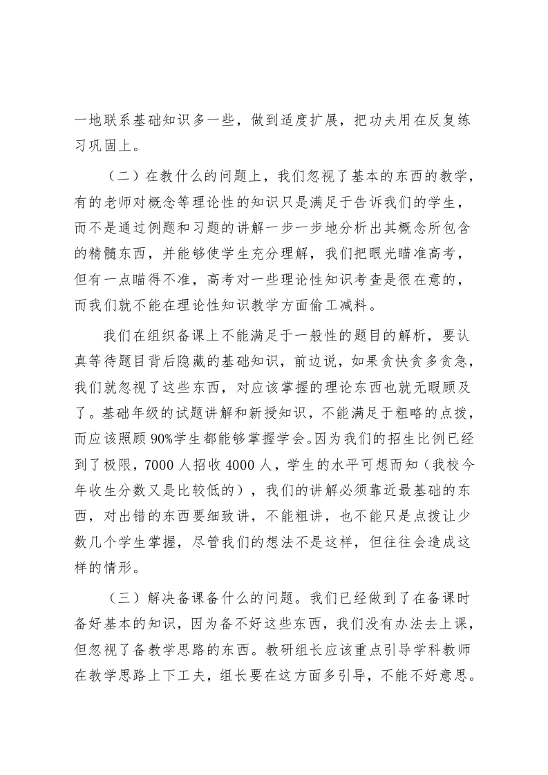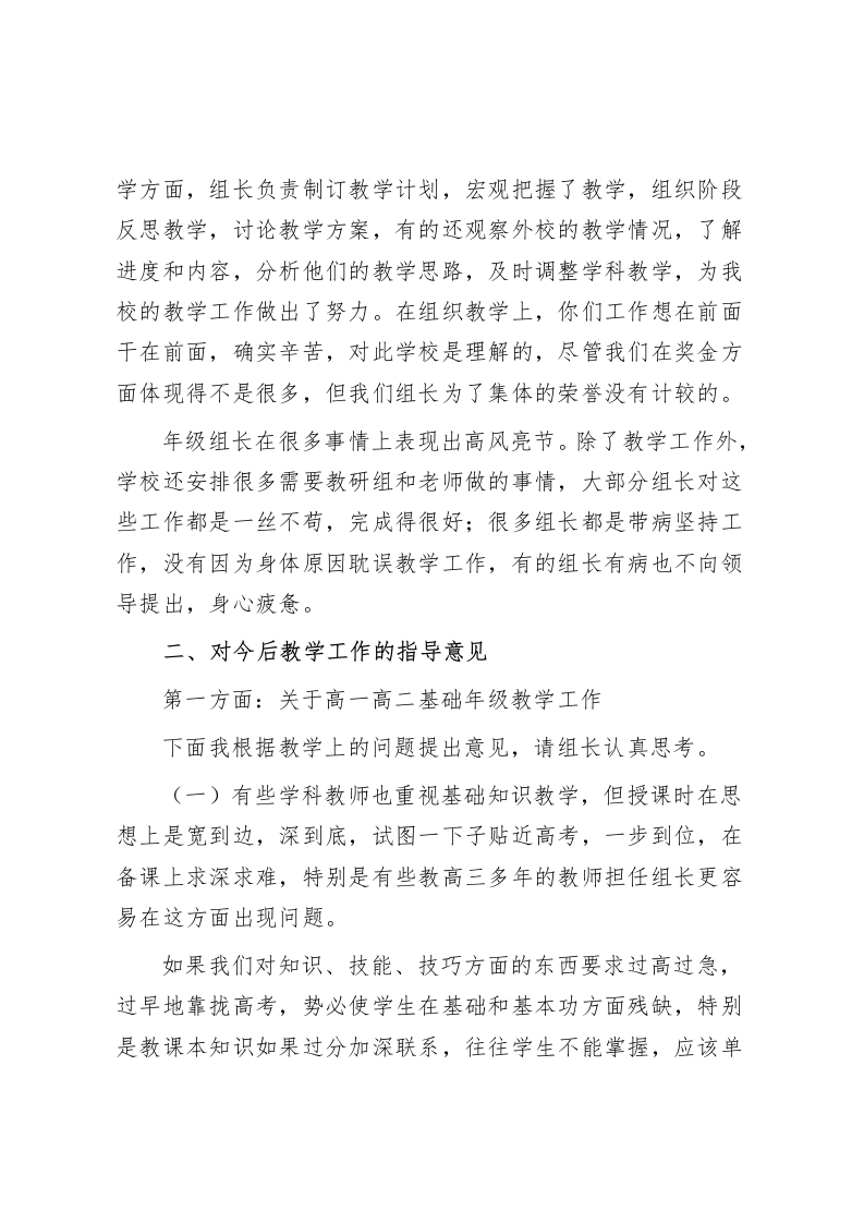 校长在期中各年级组长会议上讲话各位组长:根据开学一个阶段的教学情况,结合第一二次月考的实际,根据教学领导班子对教学工作的研究结果,我对教研组长的工作做个总结,并对今后工作提出一些意见。一、年级教研组长成为我们提高教学质量的最大支持力年级组长的事业心和责任心在支撑着我们的教学工作。很多的组长都是牺牲大量的休息时间,尽管今天的教学任务忙完了,但还在思考着,有的把作业带到家里批改,为了不耽误教学,在家用电脑组题选题;有的组长节假日几乎就没有休息,特别是女备课组长的压力和胆子就更重了,他们一方面要组织学科教学,还要照顾家庭,接送孩子,确实不是很容易的事情。年级组长为了自己的事业和学校的荣誉付出了艰辛的劳动。可以说,我们年级组长在行政上没有什么权力,而是靠着以身作则、身体力行的模范表率作用来影响着周围的老师,这一点更难做好,但我们的大部分组长做得都很好,赢得了老师的赞许。从校外老师反映看,每次月考题都有外流的情况,但被别的学校老师看到我们的题都感觉组题质量比较高,每份试题都凝聚着我们组长的心血。为了不耽误教学工作,组长在组织老师阅卷方面动了脑子,批改及时,保证了质量。在把握教