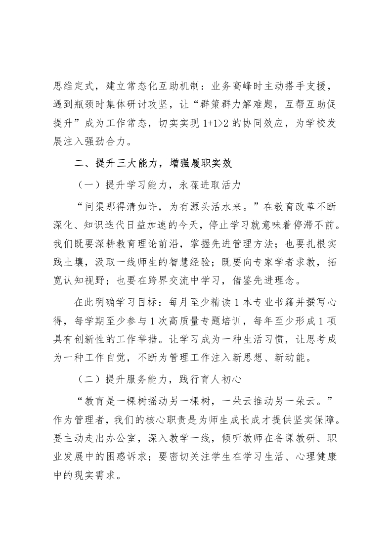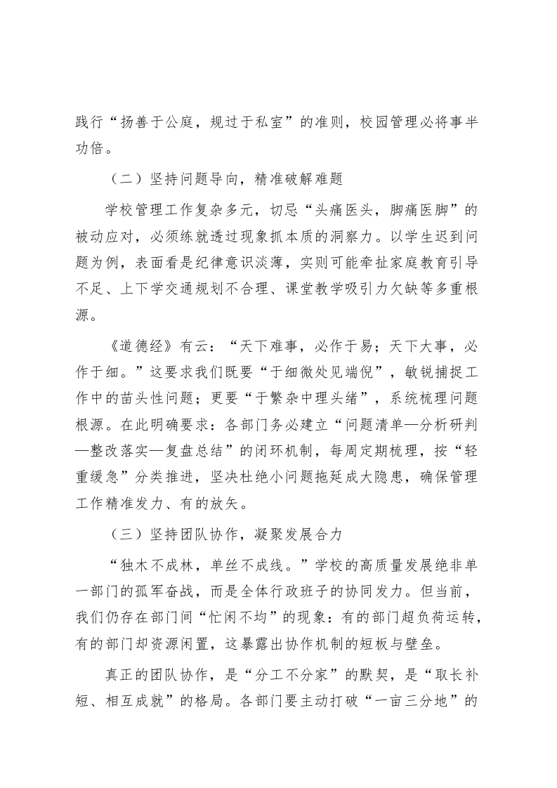 校长在学校行政班子会议上的讲话:守教育初心,强管理效能各位行政同仁:今天我们齐聚一堂,核心是明确教育管理工作的核心准则与提升方向。古人云:“君子务本,本立而道生。”作为教育管理者,我们的“本”是立德树人的初心使命,我们的“道”是精益求精的管理追求。接下来,我将围绕“三个坚持”与“三个提升”,与大家交流共勉。一、坚守三大原则,夯实管理根基(一)坚持以身作则,树立示范标杆“其身正,不令而行;其身不正,虽令不从。”管理者的言行举止是校园里最鲜活的教材,直接影响师生的行为导向。我们要求教师恪守职业规范,自己就必须成为考勤纪律的践行者:我们倡导学生涵养文明素养,自己就必须成为言行得体的示范者。不久前,我在校园里目睹了暖心一幕:一位年轻教师路过操场时,主动弯腰拾起散落的废纸屑。这一举动看似微小,却彰显了教育者的责任与素养。反观我们自身,若每位管理者都能将“以身作则”融入日常一一主动维护校园环境,自觉遵守规章制度,在公共场合彰显担当,在私下生活严于律己,真正