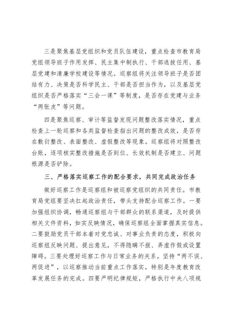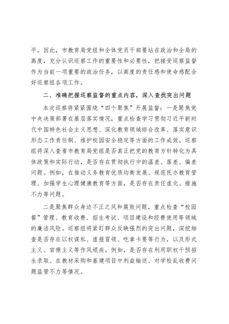 在2025年市委第二巡察组巡察市教育局党组工作动员会上的讲话根据市委统一部署,今天我们召开市委第二巡察组巡察市教育局党组工作动员会。这次巡察是市委深入贯彻落实习近平总书记关于巡视工作的重要论述和党中央决策部署的重要安排,是对市教育局党组履行管党治党责任、推动教育事业高质量发展的一次全面“政治体检”和“综合会诊”。巡察组将坚守政治巡察定位,紧扣教育领域特点,聚焦核心职责,与市教育局党组同题共答、同向发力,共同完成好市委交办的这项重要任务。一、深刻认识巡察工作的重大意义,切实增强接受监督的政治自觉巡察是党内监督的战略性制度安排,是推动全面从严治党向纵深发展的重要举措。教育事业关系国家未来和群众切身利益,市教育局党组承担着贯彻党的教育方针、落实立德树人根本任务、办好人民满意教育的重要职责。此次巡察将重点监督检查市教育局党组在贯彻落实党中央重大决策部署和省委、市委工作要求方面的实际行动,特别是推动教育改革、促进教育公平、落实“双减”政策、加强师德师风建设等情况。巡察的目的在于发现问题、推动整改、促进发展,帮助市教育局党组找准薄弱环节,补齐工作短板,进一步提升治理能力和服务水