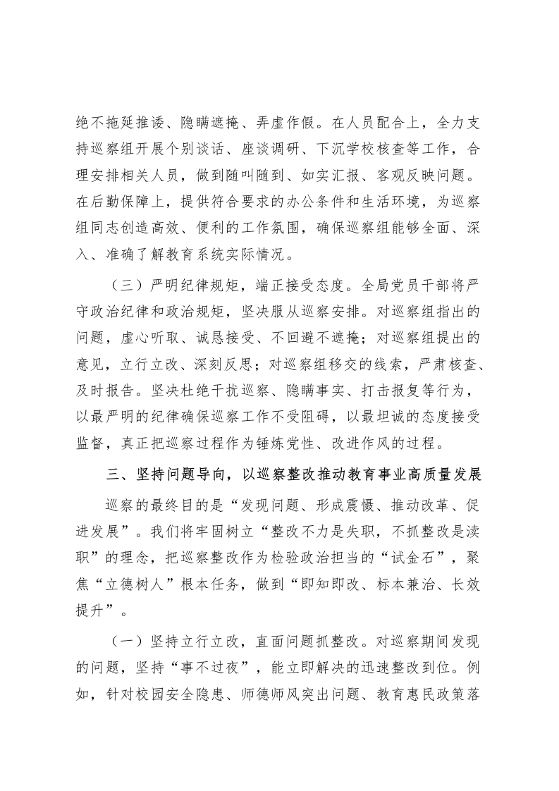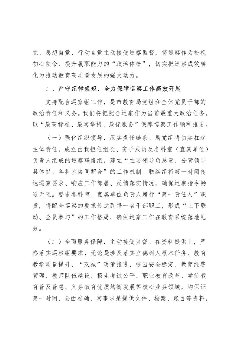 在市委巡察组进驻市教育局巡察动员会议上的表态发言尊敬的王组长,市委巡察组各位领导,同志们:刚才,王组长代表市委第四巡察组作了动员讲话,深刻阐述了本次巡察工作的重大政治意义、目标任务和工作要求,为我们接受巡察、改进工作指明了方向。讲话既是对市教育局工作的全面检视,更是对我们践行立德树人初心、办好人民满意的教育的政治鞭策,充分体现了市委对教育事业发展的高度重视和对教育系统干部队伍的关心爱护。市教育局全体党员干部将以高度的政治自觉,坚决拥护、诚恳接受巡察监督,认真学习领会、坚决贯彻落实讲话精神。下面,我代表市教育局党组,就全力支持配合巡察工作,郑重表态如下。一、提高政治站位,深刻认识巡察对教育工作的战略意义党的十八大以来,习近平总书记高度重视巡视工作,亲自谋划、亲自部署,发表一系列重要讲话、作出一系列重要指示,为新时代巡视工作提供了根本遵循。教育是国之大计、党之大计,肩负着为党育人、为国育才的崇高使命。我们将深刻认识到,接受市委巡察是坚决做到“两个维护”的具体行动,是推动教育系统全面从严治党向纵深发展的重要抓手,更是解决教育领域突出问题、办好人民满意教育的重要契机。全市教育系统将把思想和行动统一到市委决策部署上来,以高度的政治自