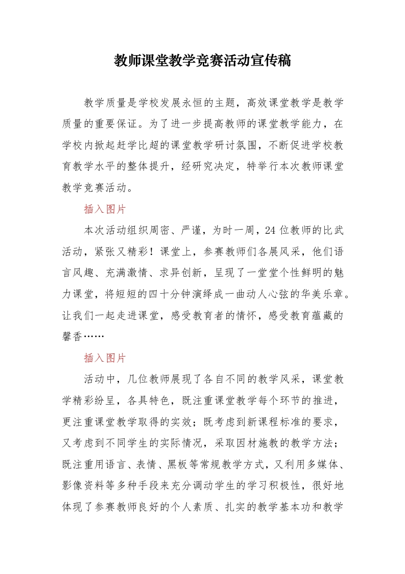 教师课堂教学竞赛活动宣传稿教学质量是学校发展永恒的主题,高效课堂教学是教学质量的重要保证。为了进一步提高教师的课堂教学能力,在学校内掀起赶学比超的课堂教学研讨氛围,不断促进学校教育教学水平的整体提升,经研究决定,特举行本次教师课堂教学竞赛活动。插入图片本次活动组织周密、严谨,为时一周,24位教师的比武活动,紧张又精彩!课堂上,参赛教师们各展风采,他们语言风趣、充满激情、求异创新,呈现了一堂堂个性鲜明的魅力课堂,将短短的四十分钟演绎成一曲动人心弦的华美乐章。让我们一起走进课堂,感受教育者的情怀,感受教育蕴藏的馨香…插入图片活动中,几位教师展现了各自不同的教学风采,课堂教学精彩纷呈,各具特色,既注重课堂教学每个环节的推进,更注重课堂教学取得的实效;既考虑到新课程标准的要求,又考虑到不同学生的实际情况,采取因材施教的教学方法;既注重用语言、表情、黑板等常规教学方式,又利用多媒体、影像资料等多种手段来充分调动学生的学习积极性,很好地体现了参赛教师良好的个人素质、扎实的教学基本功和教学