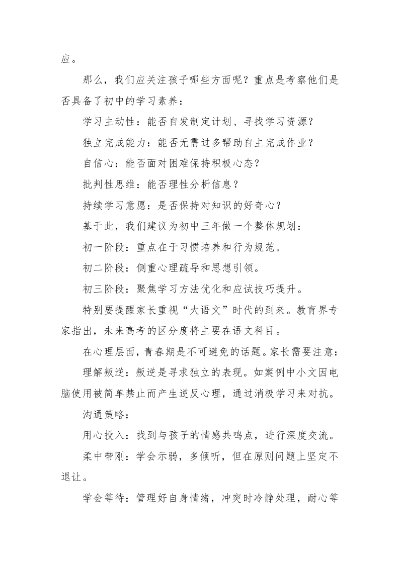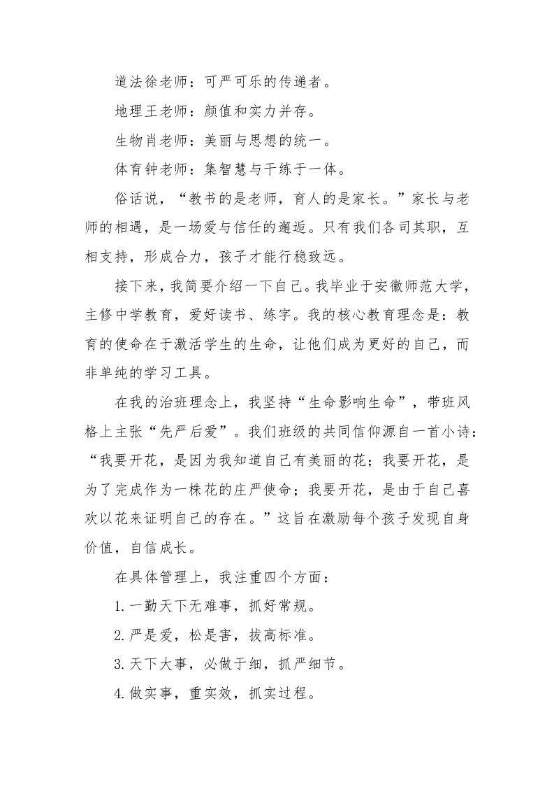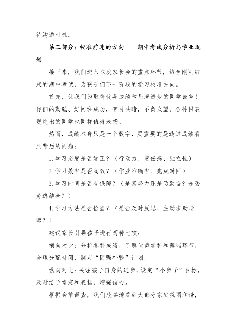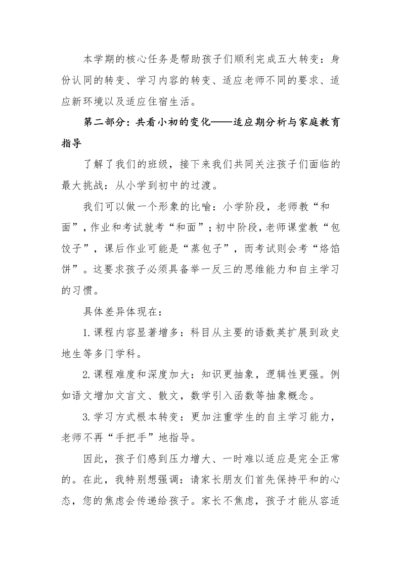 2025年秋七年级上学期期中家长会发言稿(初梦扬帆乘风起,一心携手育英才)尊敬的各位家长,上午好!感谢大家在百忙之中齐聚于此,共同开启我们初一年级的期中家长会。正如雅斯贝尔斯所言,“教育是一棵树摇动另一棵树,一朵云推动另一朵云,一个灵魂唤醒另一个灵魂。”孩子们踏入初中校园已两月有余,这两个多月里,我们共同见证了孩子们从懵懂到逐渐适应的成长历程。本次家长会,旨在搭建一座家校沟通的桥梁,让我们携手分析孩子升入初中后的适应情况,共同探讨如何更好地陪伴他们迎接未来的挑战。孩子的成长,既离不开学校的悉心教导,也离不开家庭的温暖陪伴。让我们心怀期待,共同努力,为孩子们描绘更美好的明天。再次感谢大家的到来!第一部分:遇见更好的我们一班级团队与治班理念介绍首先,请允许我向大家介绍我们七(8)班卓越的教师团队。我们拥有一支敬业奉献、各有专长的师资队伍:语文陈老师:沉稳且才华横溢。数学朱老师:率真且认真努力。英语刘老师:一朵干实事的小花。历史蒋老师:谈古论今,深受好评。
