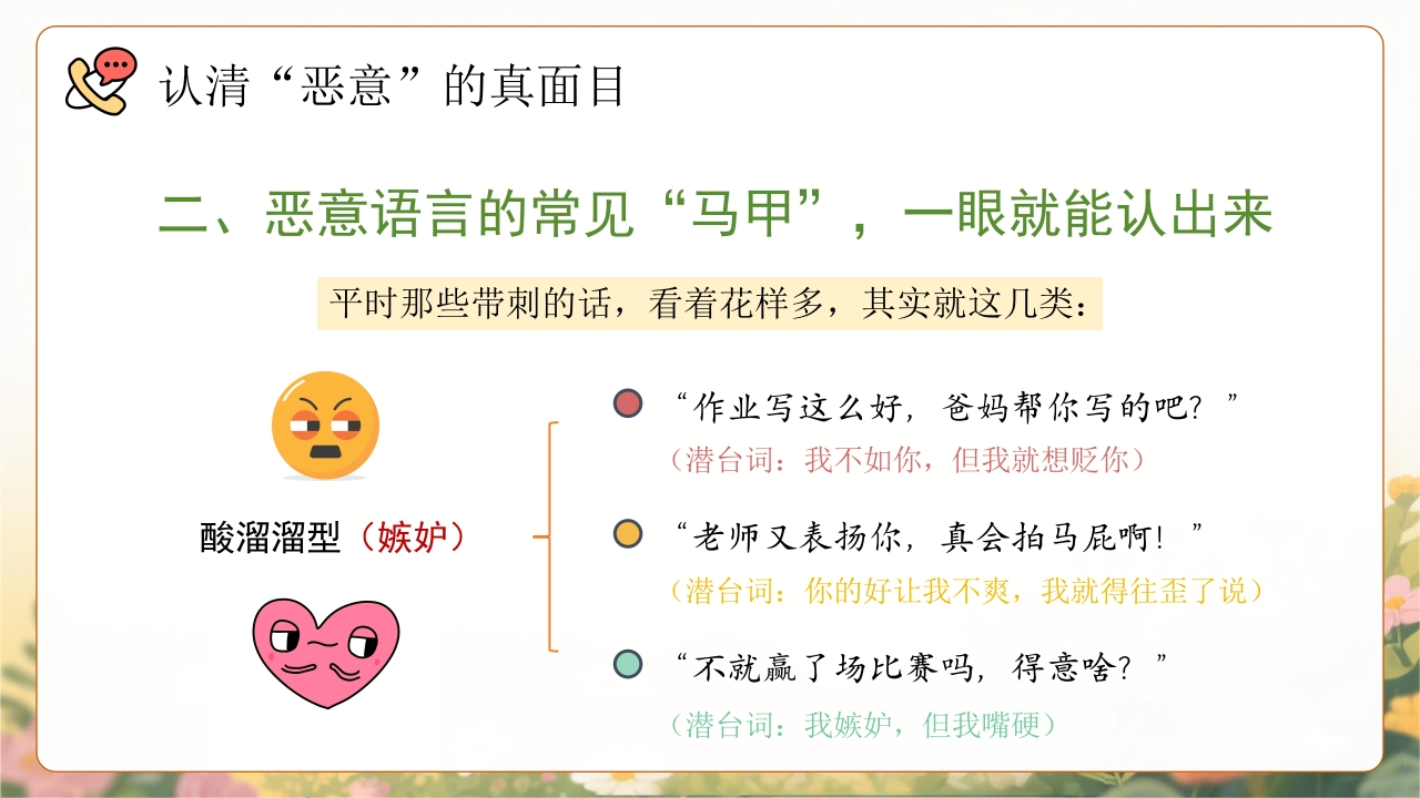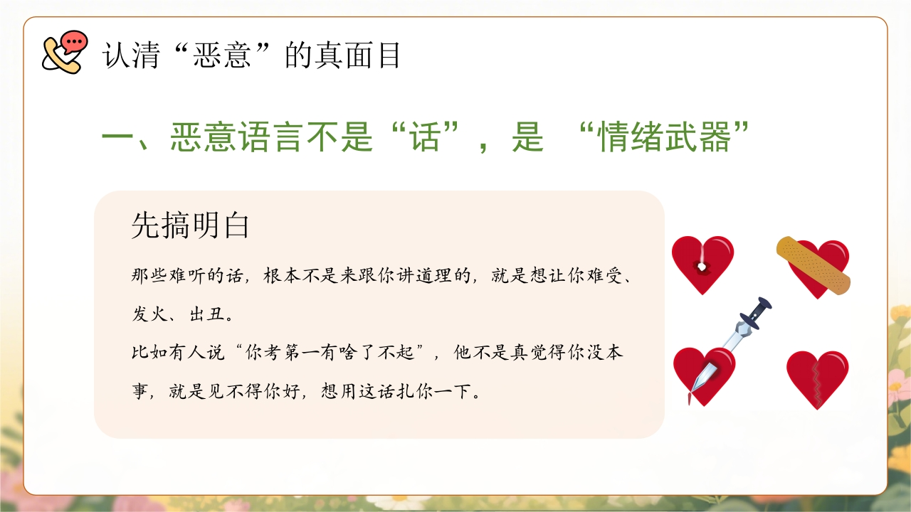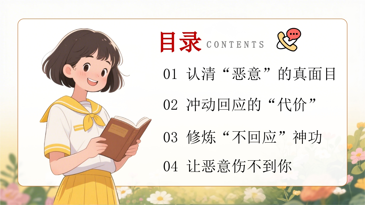 【不要回应“恶意”】主题班会-课件tangqi883小时前发布关注私信8.30MB31页0335 第1页 / 共31页 第2页 / 共31页 第3页 / 共31页 第4页 / 共31页 第5页 / 共31页 试读已结束,还剩26页,您可下载完整版后进行离线阅读 【不要回应“恶意”】主题班会-课件此内容为付费资源,请付费后查看¥9.9¥19.9VIP会员免费立即购买您当前未登录!建议登陆后购买,可保存购买订单付费资源© 版权声明本站是一个信息分享及获取的平台,不确保部分用户上传资料的来源及知识产权归属,资料由老师投稿,公开渠道整理,网友上传,如果侵犯到您的权益,请联系客服删除THE ENDPPT课件教师资料 文本预览 受将人际交往主题班会将不要回应“恶意恶意语言是“情绪垃圾”,谁接谁倒霉,咱不接!班级:XXX教师:柚子坊 查看更多 收起部分 喜欢就支持一下吧点赞5 分享QQ空间微博QQ好友海报分享复制链接收藏