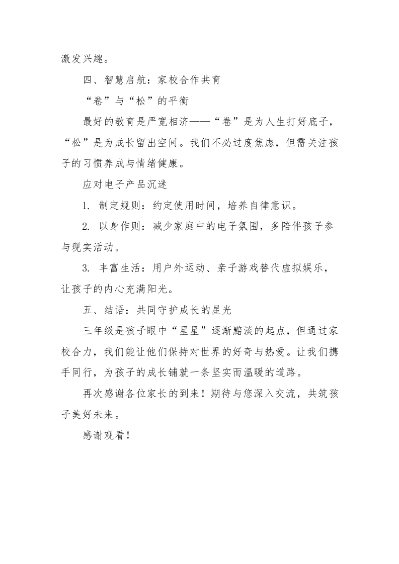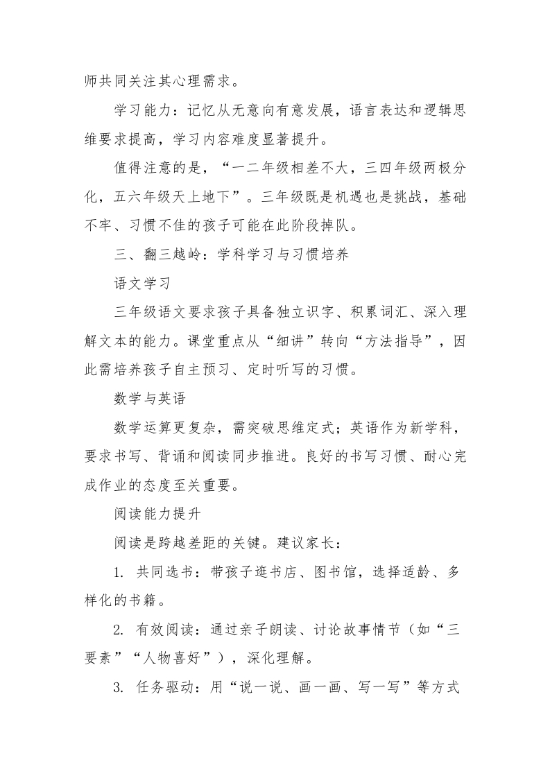2025年秋季三年级上学期家长会发言稿(家校携手,共赴成长之约)尊敬的各位家长朋友们:大家下午好!感谢大家在百忙之中抽出时间参加本次家长会。我是三年级班主任秦老师。今天我们齐聚一堂,共同探讨孩子们成长的新篇章一一三年级,这一承上启下的关键阶段。一、温暖相迎:我们的班级与教育理念我们班是一个由41名同学组成的温暖集体,其中女生19位,男生22位。孩子们在校的每一天都充满闪光瞬间,他们热爱朗读、运动、阅读与生活。我们始终坚持“德智体美劳全面发展”的育人目标,希望每个孩子都能拥有健康的身心、阳光的性格,以及探索世界的热情。语文刘老师(电话:)和数学王老师(电话:)将与我一齐陪伴孩子们成长。我们坚信,童年的珍贵在于快乐与成长并存,而家校合作是实现这一目标的核心力量。二、成长密码:三年级的身心变化与挑战三年级是孩子从低年级向高年级过渡的关键期,他们的生理、心理及学习能力正经历显著变化:生理特点:大脑发育趋于成熟,自我控制能力增强,但仍需引导。心理特点:个性差异增大,情绪波动明显,需家长与老