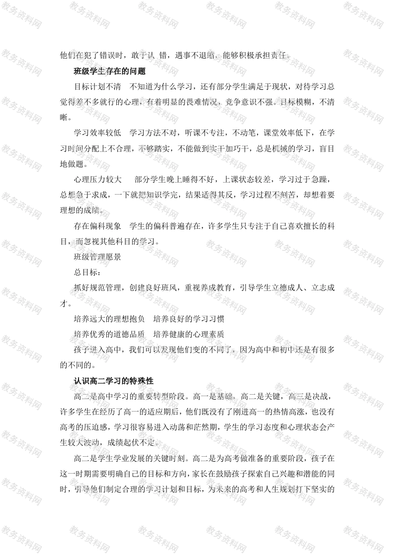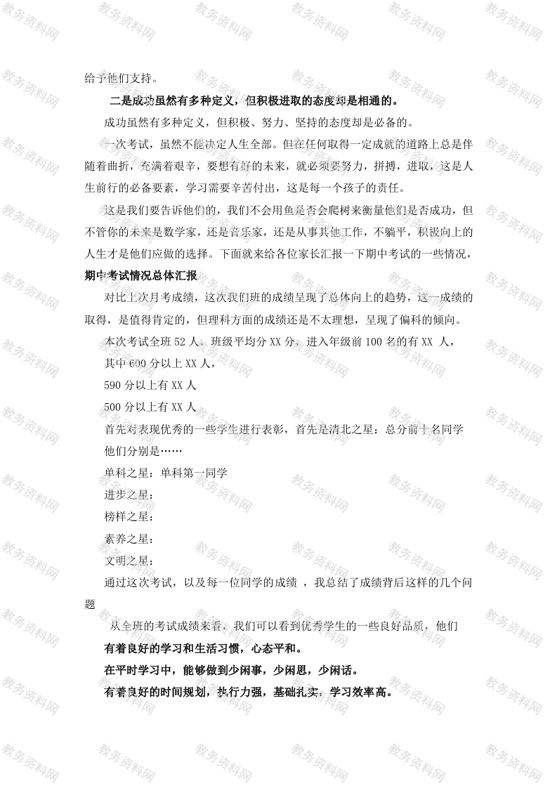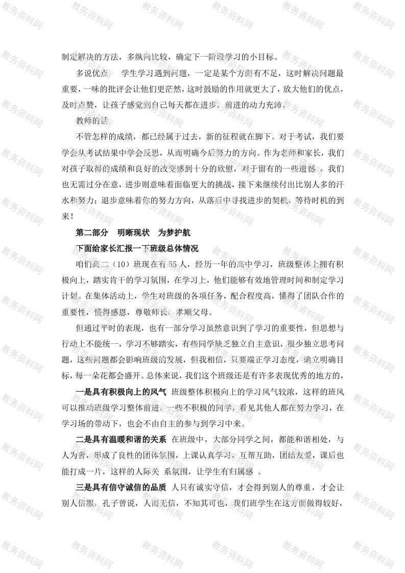 高二期中家长会《同心共育筑梦远航》发言稿尊敬的各位家长:大家下午好!首先感谢各位家长们能抽出时间来参加今天的家长会,今天,我们将在这时共同探讨我们孩子的成长和教育问题。教育是一次美丽的相遇,更是相遇后的相知,我们在这里的相遇,是为了更好的了解我们的孩子,更好地支持他们的学习和成长,凝聚学校与家庭的教育合力。在这里,我要特别感谢每一位家长的到来,正是因为有了你们的参与和支持,才让我们的各项工作能够顺利开展。今天,我们是为了一个共同的目标而相聚,那就是孩子的成长和成功。教育是一场旅程,它不仅仅是知识的传授,更是价值观的培养、人格的塑造和梦想的启迪。需要我们老师和家长的双向奔赴,共同创造一个充满爱与理解的教育环境。让我们一起共同努力,为孩子们打造一个幸福的成长旅程。几点提醒:1.请您在会议期间把手机调至静音或者关闭。2.家长会期间尽量不要接打电话。3.若有特别紧急的事情需要处理,请从后门离开教室,尽量不影响他人。第一部分找准起点让梦启航首先和各位家长一起来观看视频:考试不是人生的全部,致家长的一封信!相信各位家长看完视频之后,都有一些感悟,我看完得到了两点关于教育的启示,与大家共勉。一是家长要正确对待学生的考试成绩。在目前的教育环境下,作为一名家长不关注学生的成绩,是绝对不可能的,但仅仅只关注考试成绩又是绝对不可取的。考试也不是人生的全部,不是衡量成功的唯一标准。因为一场考试相对于未来的每一次人生中的每一次大考来说,根本算不了什么。一次考试低分并不能夺走他的梦想。考试无论好坏,都不值得过分看重,重要的是了解你的孩子长处和不足,与孩子一起分析,如何解决,从而为孩子指明方向和道路,多关注成绩所带来的成长让孩子充满信心学习下去,相信他们,并