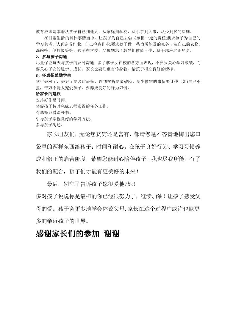 初中英语家长会发言稿某某班英语家长会尊敬的各位家长:大家好!你们好!我是本班的英语老师,很高兴能有这个机会和大家共同探讨孩子们的学习和成长情况,希望今后能与大家多交流,为了孩子们的成长共同努力!今天在此借用家长们的宝贵时间向您们汇报一下我们学校英语教学情况并真诚的邀请您们与我们携手架起学校与家的桥梁,构建学生英语学习的通途。为他们创造一个良好的学英语的环境。英语期中考试成绩情况参与阶段性学习摸查的总人数:45人A(100-90)22人B(90-70)12人C(60及以下)11人通过对本次考试成绩分析,从整体来看,学生的基础知识掌握的比较好。失分较多的是听力题。学生听力理解能力有待强化,特别是在语速快的情景下,平时要多加练习。年级第一名徐奇晨、韩有乐、孙文海学习之星朱璟成、张学奕、刘晋嘉、何琦蕴、宋晓涵、进步之星孙振凯、高惠思、梁诗筠、侯文羽优秀学生的共同特点01学习态度端正、勤奋02学习方法比较好03自制力强,善于思考04当然也离不开家长的支持与鼓励亲爱的家长朋友们本次考试的综合性比较强,但是检验了学生的学习情况。但是考试的分数只是一个参考,不要因为孩子的高分自满,也