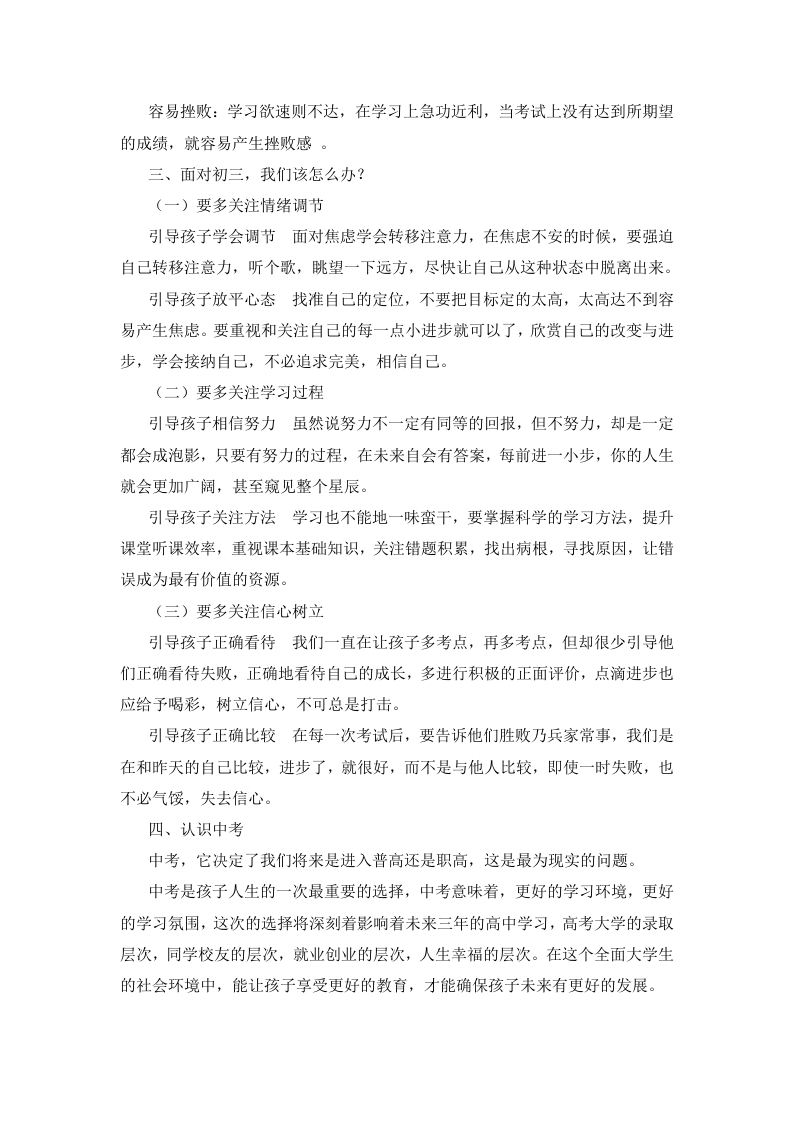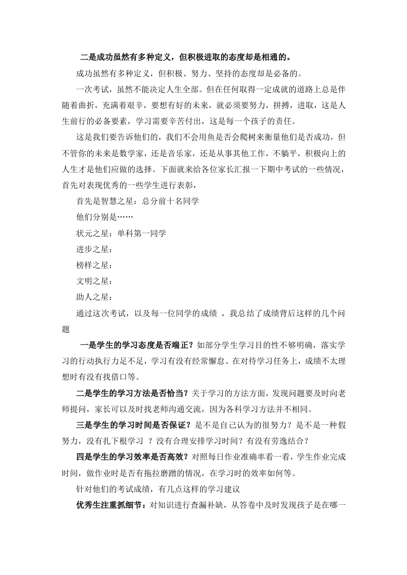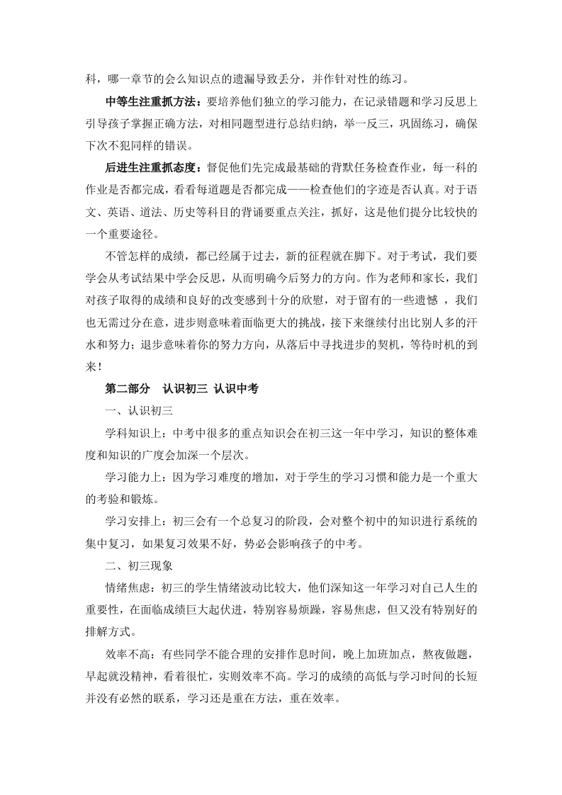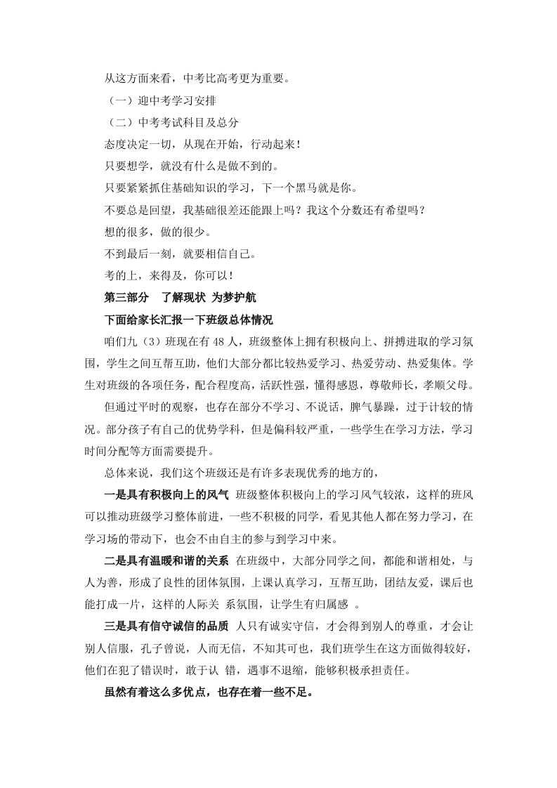 九年级期中家长会《同心助力共振飞翔》发言稿尊敬的各位家长:大家下午好!首先我作为班主任,并代表我们班全体科任老师感谢各位家长能在百忙中抽出时间来参加这次家长会,这是你们对孩子的爱,也是对我们老师工作的支持和帮助。正是有了你们的信任、理解、支持,我们的工作才能顺利开展。因为孩子,我们彼此产生了联系,因为孩子,我们选择了双向奔赴。今天我们聚在一起,是为了能更好地为我们的孩子的学习和发展服务。在初三这样一个关键的阶段,孩子们面临着中考的压力和挑战。这时的他们需要我们的关心和支持,需要我们帮助他们应对学习和生活中的挑战,希望能够通过这次家长会,让我们教师和家长达成共识,形成合力,一起努力,为即将到来的中考做出最好的准备。几点提醒:1.请您在会议期间把手机调至静音或者关闭。2.家长会期间尽量不要接打电话。3.若有特别紧急的事情需要处理,请从后门离开教室,尽量不影响他人。第一部分回顾成绩追梦前行首先和各位家长一起来观看视频:考试不是人生的全部,致家长的一封信!相信各位家长看完视频之后,都有一些感悟,我看完得到了两点关于教育的启示,与大家共勉。一是家长要正确对待学生的考试成绩。在目前的教育环境下,作为一名家长不关注学生的成绩,是绝对不可能的,但仅仅只关注考试成绩又是绝对不可取的。考试也不是人生的全部,不是衡量成功的唯一标准。因为一场考试相对于未来的每一次人生中的每一次大考来说,根本算不了什么。一次考试低分并不能夺走他的梦想。考试无论好坏,都不值得过分看重,重要的是了解你的孩子长处和不足,与孩子一起分析,如何解决,从而为孩子指明方向和道路,多关注成绩所带来的成长让孩子充满信心学习下去,相信他们,并给予他们支持。