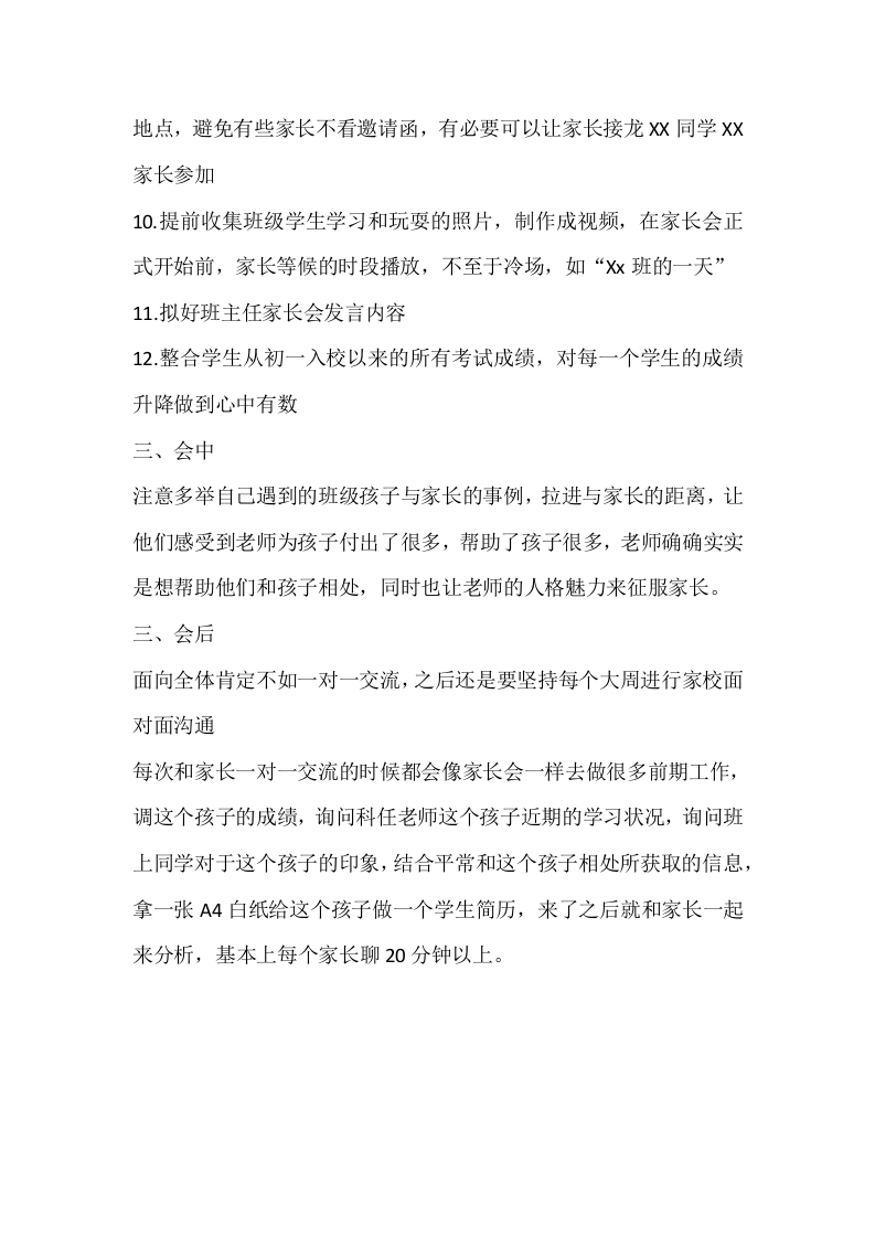 家长会筹备注意事项一、明确活动目的:以家长会为契机,让家长真正了解到孩子在校的真实表现,以及学校老师所做的一系列助力孩子成长的工作,增进家长和学校的感情,更好的形成家校教育的合力,为以后的教育教学工作营造良好的氛围。二、做好会前准备:1.确定家长会流程2.小组长写好组员学情评价:组内定位、优点、缺点、性格、改进,写完过审3.安排表演任务:哪些同学负责表演哪些学科的展演,并让孩子与科任老师进行沟通,确定好节目,做好pt并自主排练,主持人写好串词4.确保会议顺利进行:在家长会正式开始之前得在班主任的监督把关下进行两次及以上排练,期间确定好幻灯片切换员,翻页笔,与汇演课件进行磨合5.确保家长顺利入室就位:打印好家长签到表,学生提前做好座位牌,家长到教室入座后安排一位同学以轮流签到的方式完成签到6确保教室干净整洁:文化墙美观,黑板布置美观,欢迎标语醒目7准备好饮用水,条件允许备好果盘8.安排6个大方有礼的学生带上班牌去校门口迎接家长,4名同学在教室前后门带领到教室的家长入座9.在家长群内发送家长会邀请函以及文字信息,编辑好家长会时间,