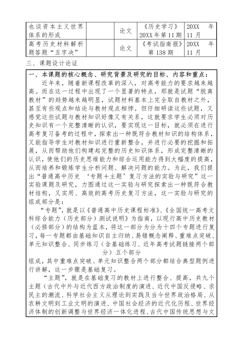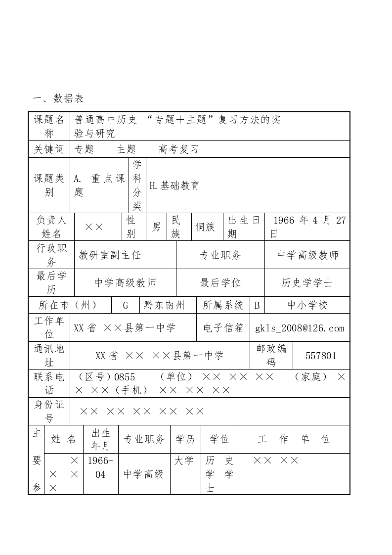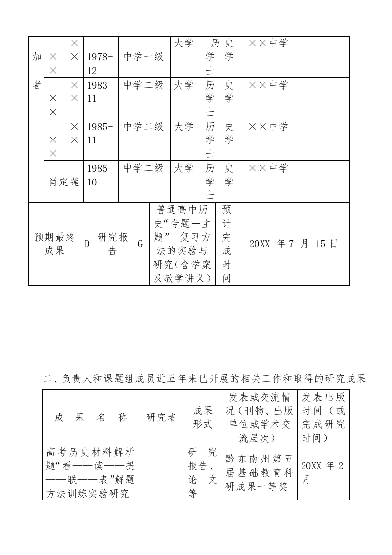 xx省教育科学规划:课题申请·评审书tangqi8811小时前发布关注私信0.12MB23页03013 第1页 / 共23页 第2页 / 共23页 第3页 / 共23页 第4页 / 共23页 第5页 / 共23页 试读已结束,还剩18页,您可下载完整版后进行离线阅读 xx省教育科学规划:课题申请·评审书此内容为付费资源,请付费后查看¥9.9¥19.9VIP会员免费立即购买您当前未登录!建议登陆后购买,可保存购买订单付费资源© 版权声明本站是一个信息分享及获取的平台,不确保部分用户上传资料的来源及知识产权归属,资料由老师投稿,公开渠道整理,网友上传,如果侵犯到您的权益,请联系客服删除THE END学校教务德育资料校长资料 文本预览 附件1:编号xx省教育科学规划课题申请·评审书课题名称普通高中历史“专题十主题”复习方法的实验与研究课题类别A.重点课题学科分类H.基础教育课题负责人X××××X负责单位XX省××学校填表日期20xx年x月x日xx省教育科学规划领导小组办公室20xx年6月修订 查看更多 收起部分 喜欢就支持一下吧点赞13 分享QQ空间微博QQ好友海报分享复制链接收藏