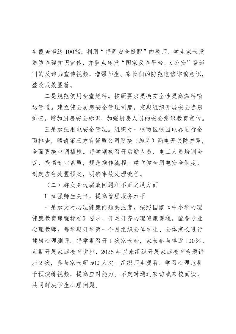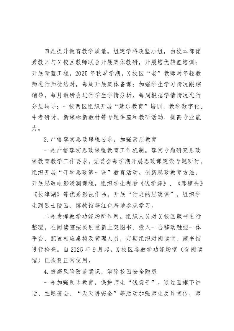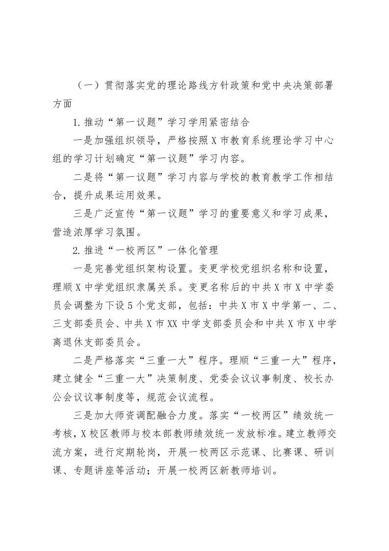 X中学党组织关于巡察集中整改进展情况的报告根据市委统一部署,202X年X月中旬至X月中旬,市委第一巡察组对X市X中学(含X校区)党组织开展十四届市委第七轮巡察,并于2025年X月X日向X中学(含X校区)党组织反馈巡察意见。按照巡察工作有关要求,现将巡察集中整改进展情况予报告如下。一、党组(党委)履行巡察整改主体责任情况(一)高度重视,深化思想认识。市委第一巡察组反馈巡察意见后,X市X中学党委高度重视巡察整改工作,将此次巡察整改工作作为一项重大政治任务抓实推进,以高度政治责任感、有力工作措施、严明工作纪律确保整改工作取得实效。(二)迅速部署,加强组织领导。对照巡察反馈意见,X市X中学召开专题党委会对整改工作进行研究部署,成立党委书记任组长的巡察整改工作领导小组,制定整改方案,将巡察反馈问题细化并落实整改措施,逐条明确责任领导、责任部门、整改期限和目标要求,确保整改任务不打折扣落实到位。(三)狠抓落实,有序推进整改工作。认真压实整改工作任务,以高度政治责任感和强烈使命担当,聚焦巡察反馈问题,深挖问题根源,采取对账销号、举一反三的方式即知即改、立行立改、全面整改,认真推动问题解决。二、巡察集中整改落实情况