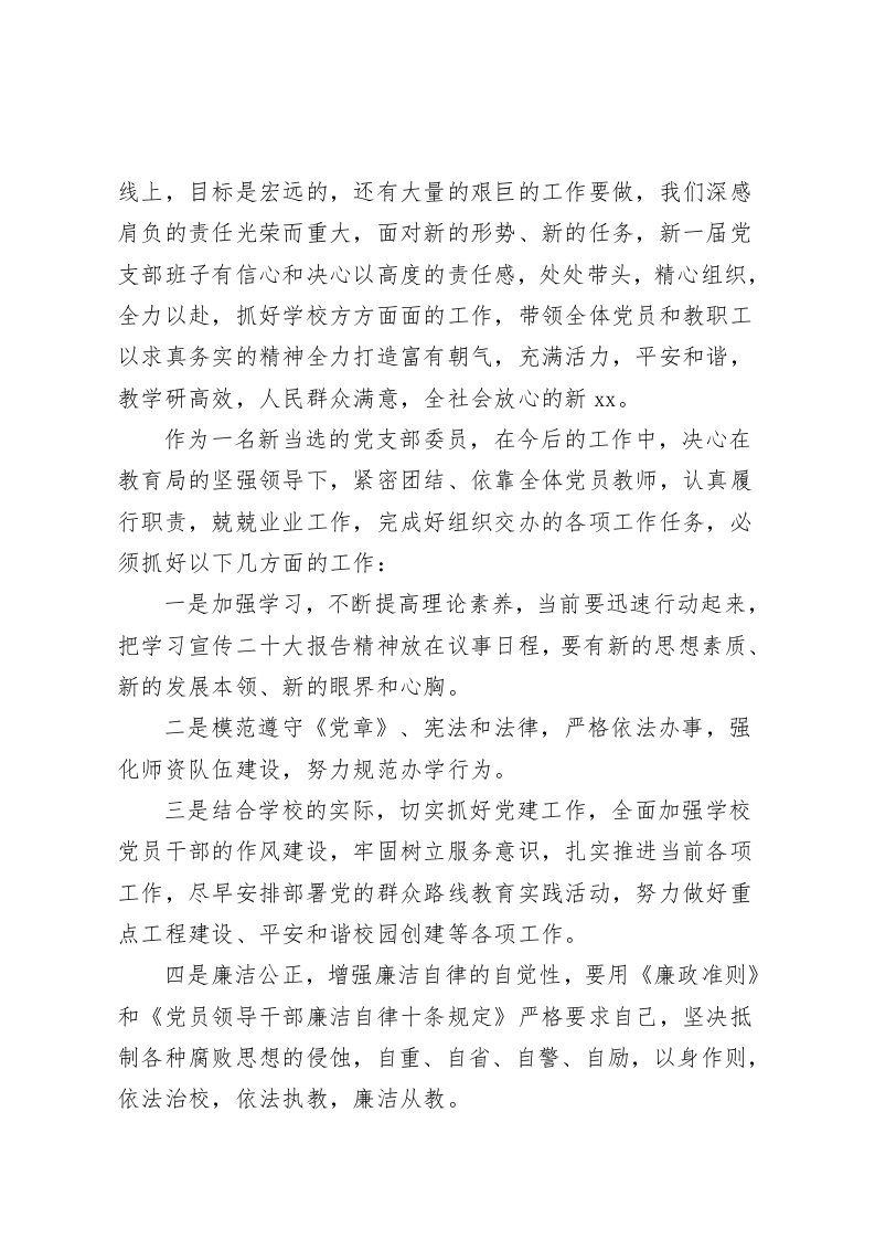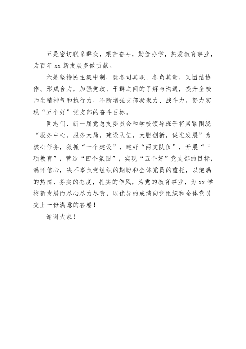 砥砺前行,实现“五个好”的目标一一在学校党总支换届选举大会上总结发言各位领导、同志们:大家下午好!在教育局的正确领导、大力关心支持并亲临指导下,xx学校新一届党总支委员顺利诞生了。经过充分的酝酿和讨论,大会以无记名投票的方式,选举产生了新一届党总支委员,达到了大会预期的目的。这是我校政治生活上的一件大事,也是党员同志们比较关心的一件大事。借此机会,请允许我代表新当选的总支委员,对区教育工委和各位党员对我们的信任与厚爱,表示衷心的感谢!同时,还得真诚地感谢上届党总支委员和全体党员教师在过去三年里,对学校工作和党总支工作的辛勤付出,尤其是要感谢xx同志为学校党总支工作所付出的巨大努力,让我们以热烈的掌声表示崇高的敬意和衷心的感谢!我们新一届总支部委员会将精诚团结,解放思想,增强意识,开拓创新,求真务实,克难而进,始终保持积极向上的人生斗志和奋发有为的精神状态,紧紧围绕“学校中心工作,强化队伍建设,增强服务意识,狠抓教育质量”这一目标,刻苦学习,勤奋工作,努力促进xx学校新发展,不辜负局党工委的重托和人民群众的期望。国家的十五五规划和二0三五年远景目标已经制定,必将给教育事业带来长足的发展,我们xx学校已经站在了新的起跑