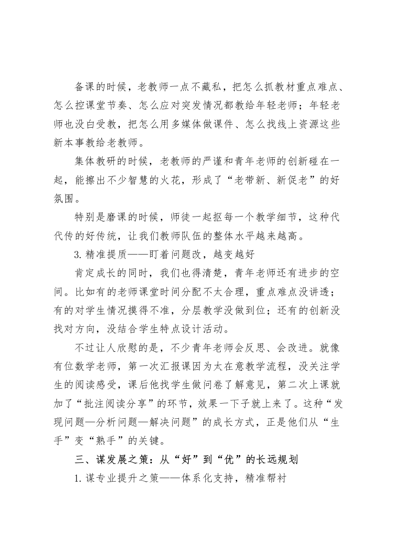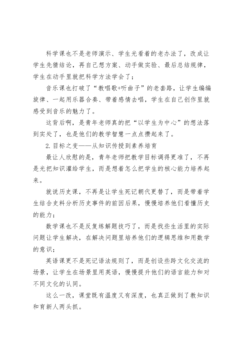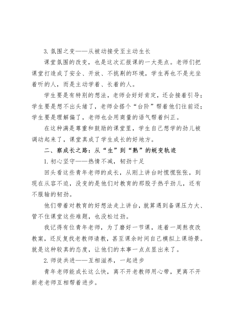 青年教师汇报课后,校长总结发言:以“三观三察三谋”谈成长、谋长远各位老师:大家好!刚才我们一起看完了青年教师汇报课的展示,说实话,看着年轻老师们在讲台上稳稳当当把控课堂的样子,听着教室里师生互动的那些讨论声,我心里特别高兴,也特别期待。这可不只是青年老师把自己的教学本事亮出来了,更能看出我们学校教师队伍是一代传一代,一直有活力、不停步的真实样子。今天啊,我想结合这次活动的观察和想法,跟大家分享三点心里话。一、观课堂之变:从“形”到“神”的深度进阶1.互动之变一一从表面热闹到深度探究这次汇报课最明显的变化,就是课堂互动跟以前比真的不一样了,是质的提升。再也不是那种走形式的你问我答,换成了能让学生动脑子的深度互动。比如语文课,不再是光分析段落了,而是让学生对比着读几篇文章,再跟着一连串问题去琢磨,在互相讨论观点里把课文意思吃透;