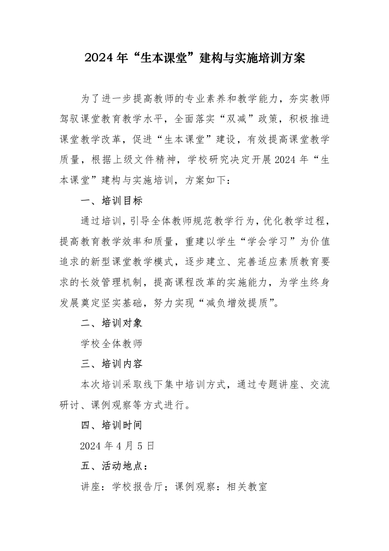 2024年“生本课堂”建构与实施培训方案为了进一步提高教师的专业素养和教学能力,夯实教师驾驭课堂教育教学水平,全面落实“双减”政策,积极推进课堂教学改革,促进“生本课堂”建设,有效提高课堂教学质量,根据上级文件精神,学校研究决定开展2024年“生本课堂”建构与实施培训,方案如下:一、培训目标通过培训,引导全体教师规范教学行为,优化教学过程,提高教育教学效率和质量,重建以学生“学会学习”为价值追求的新型课堂教学模式,逐步建立、完善适应素质教育要求的长效管理机制,提高课程改革的实施能力,为学生终身发展奠定坚实基础,努力实现“减负增效提质”。二、培训对象学校全体教师三、培训内容本次培训采取线下集中培训方式,通过专题讲座、交流研讨、课例观察等方式进行。四、培训时间2024年4月5日五、活动地点:讲座:学校报告厅;课例观察:相关教室