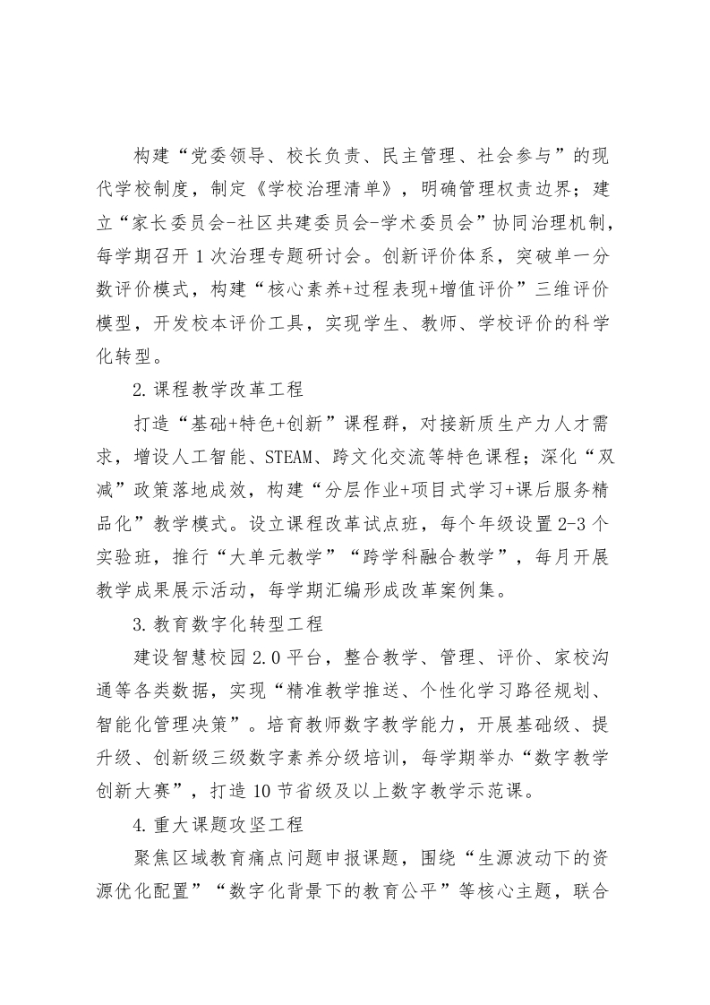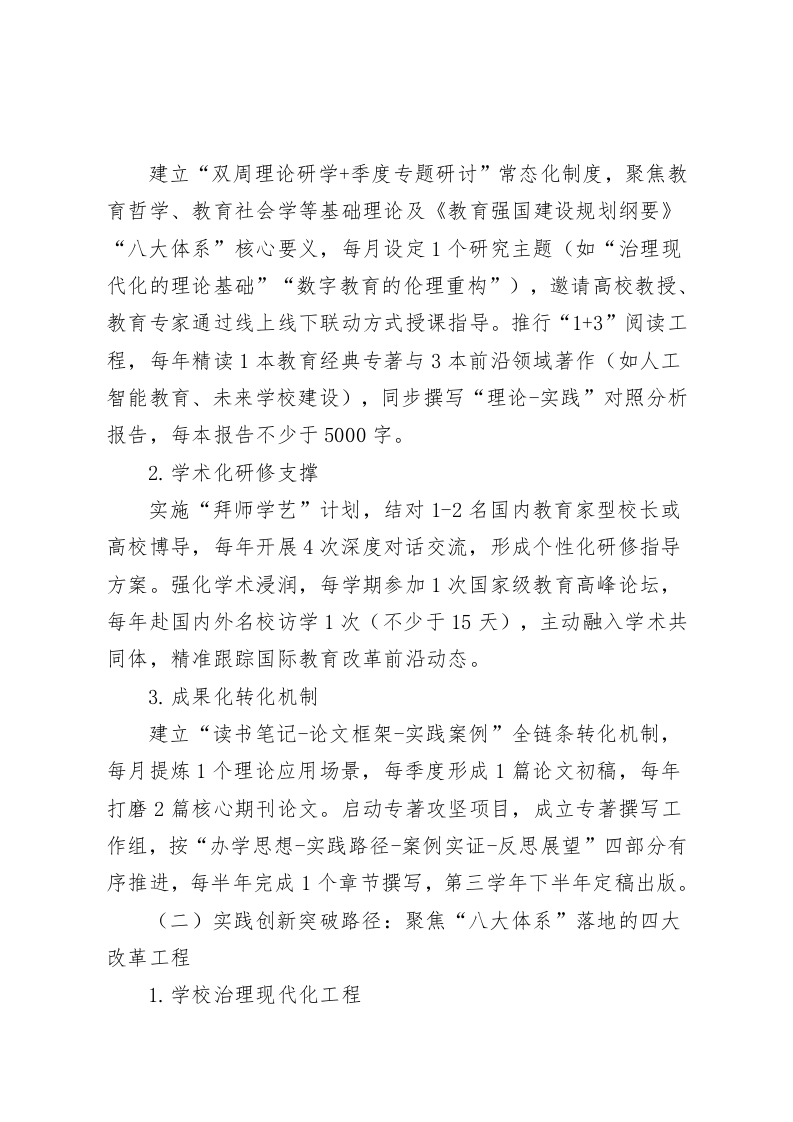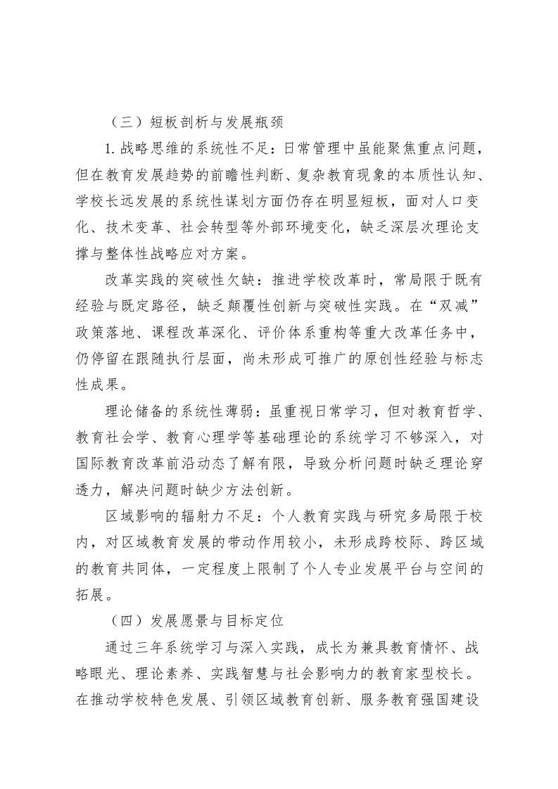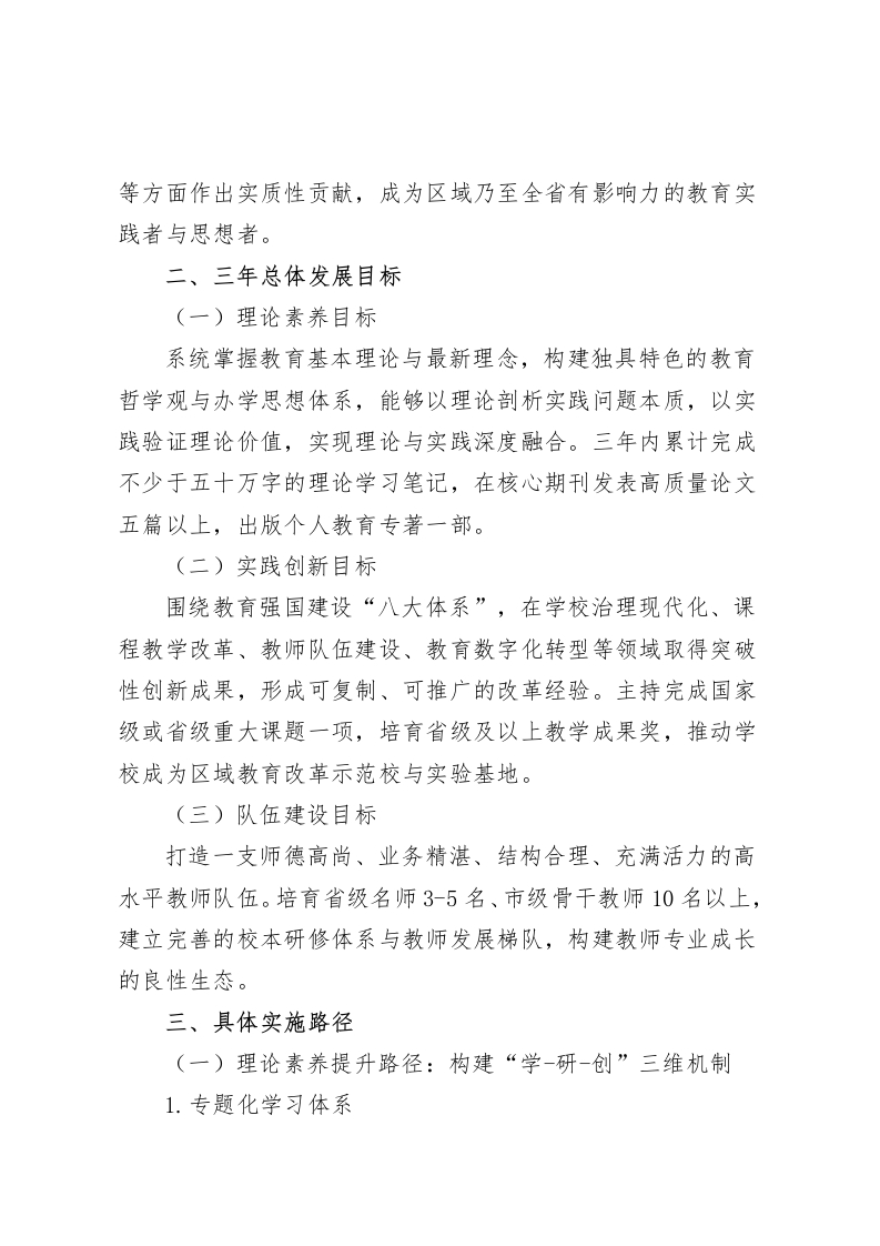 校长个人三年发展规划(2026-2029学年)本人自2022年担任校长以来,深刻认识到在中国式现代化教育推进进程中,需持续提升战略思维、改革创新与实践引领能力,方能更好推动学校高质量发展,为区域教育事业进步贡献应有之力。经系统性思考与深入调研,特制定本2026-2029学年三年发展规划。一、现状分析与问题诊断(一)教育背景的深刻变革当前教育发展正处于前所未有的复杂环境之中,《教育强国建设规划纲要(2024-2035年)》明确提出全面建设“八大体系”,对基础教育改革提出了更高标准与要求。人口结构变迁引发的生源波动、新质生产力发展对人才培养提出的新诉求、数字技术对教育形态的深度重塑、社会对教育公平与质量的双重期待,均要求校长具备更强的战略判断力与系统改革能力。(二)个人优势与发展基础本人深耕教育领域16载,其中6年担任中层管理职务,3年校长履职经历,在实践中逐步形成“以学生发展为中心、以教师成长为基石、以课程创新为手段、以数字赋能为支撑”的办学思路。期间主持完成省级课题两项,在核心期刊发表教育研究论文八篇,荣获省级教学成果奖一项、市级三项,在课程体系构建、教师专业发展引导、教育数字化转型等工作领域积累了丰富经验。