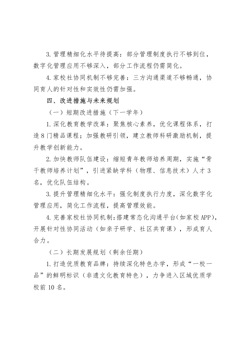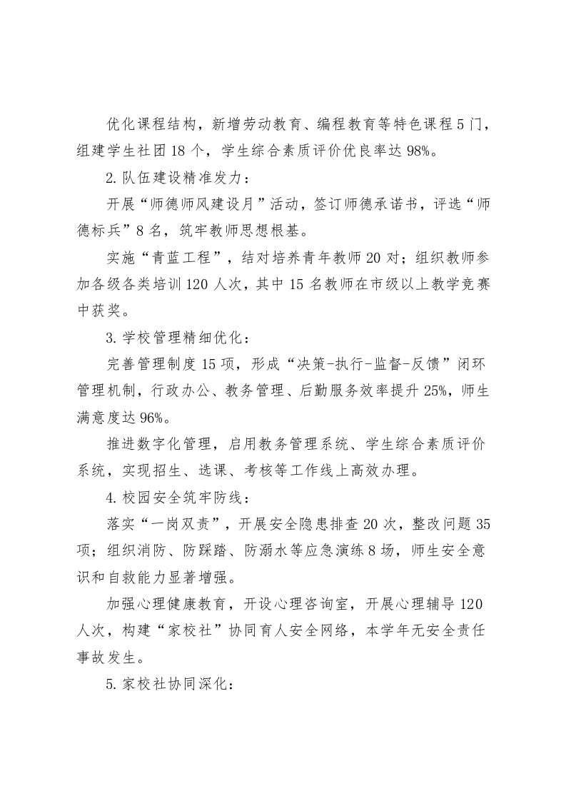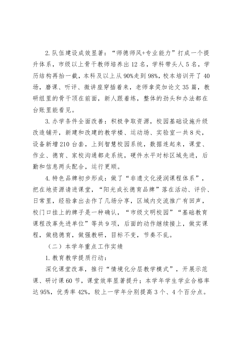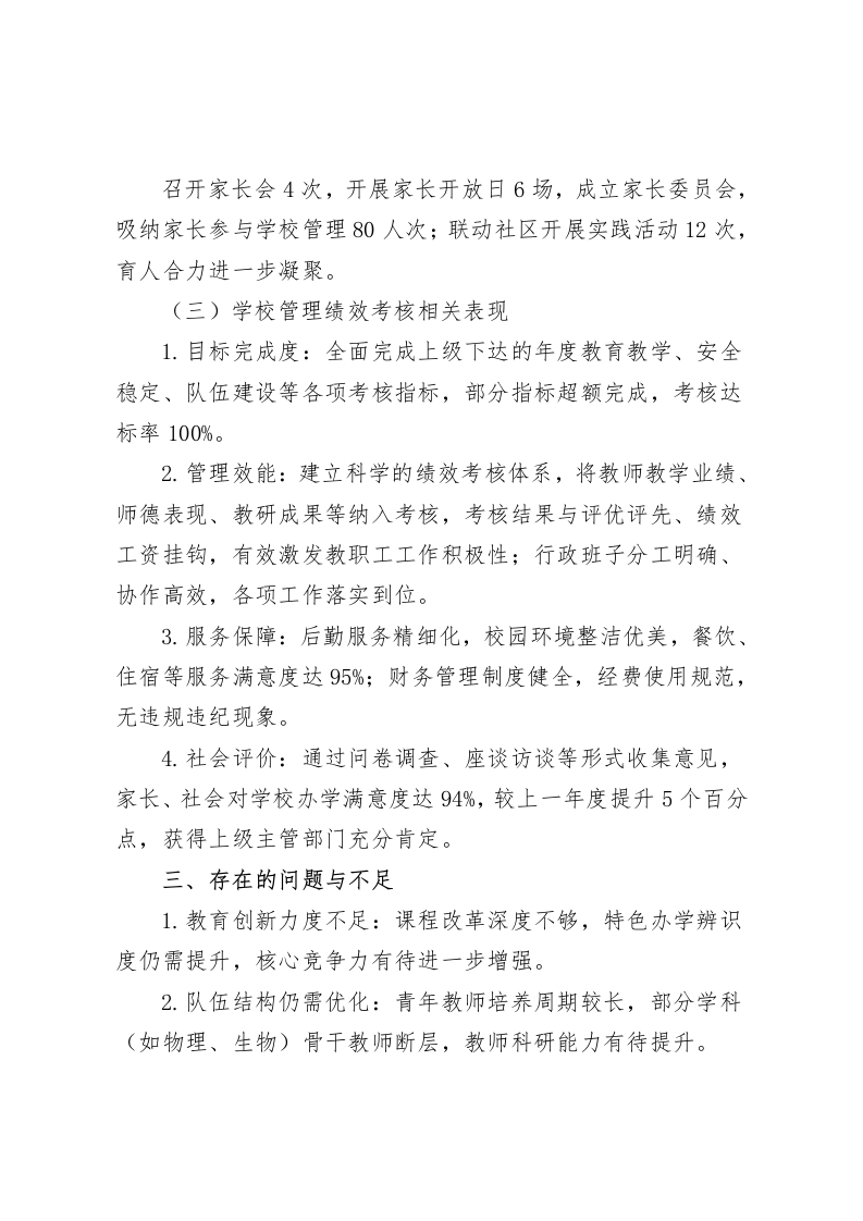 校长学年任期考核及学校管理绩效考核述职报告尊敬的考核组领导、各位同仁:大家好!一、履职情况现将本人担任校长以来的任期工作、本学年履职情况及学校管理绩效考核相关工作进行述职,请各位评议。我任职以来,抓住“立德树人”这根主线,以人为本、质量立校、特色发展,以“办人民满意教育”为宗旨,统筹推进各项工作,教学这边盯课堂、盯作业、盯学风,队伍这边盯师德、盯专业成长,服务和管理稳步走,校园安全天天过一遍清单,本学年始终以“提质增效、内涵发展”为主线,难点一块块拆,基础一层层垫,推进的节奏稳住了,各板块有回应,管理的效能也就提上来了。二、主要工作成效(一)任期核心成果1、办学质量持续攀升:任期内中高考的数据往上走,合格率、优秀率比任职初期多了7%、8%,学生跑去学科竞赛、文体活动、科技创新,拿回了62个奖,国家级3个、省级15个,卷子里的成绩有改观,赛场上的表现也有站位,家长群里反馈更踏实,班主任例会上能对得上数字,任课老师把复盘做细,下一步目标明确。