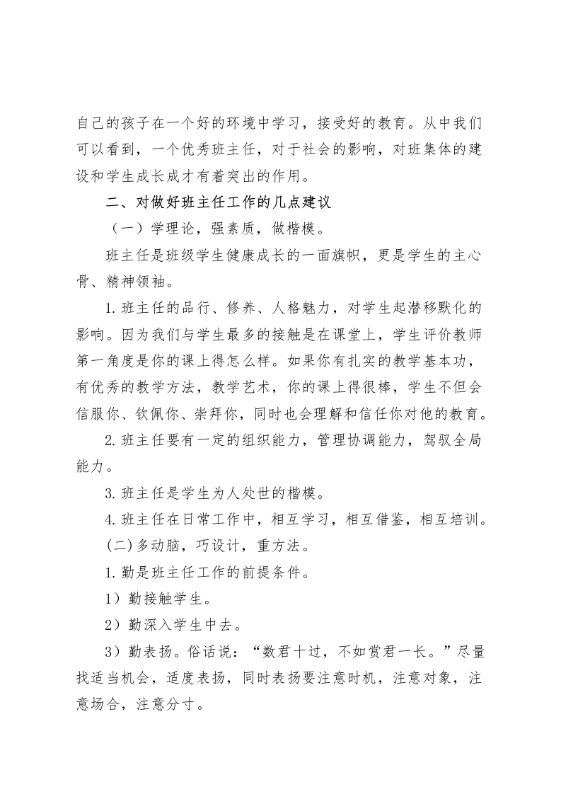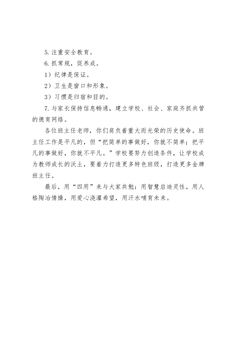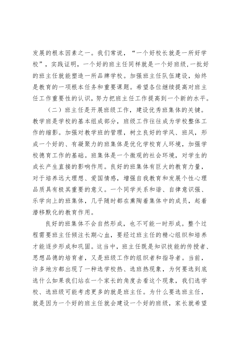 校长在班主任工作会议上讲话强化爱与责任意识,扎实做好班主任工作各位班主任老师,大家好!今天,我们召开这个班主任工作会,主要是总结班主任工作经验,交流班级管理心得,这次会议开的很好,各位班主任都把自己好的经验与大家分享,同时借着这次机会相互取长补短。希望我们不光是在今天,还要在平时相互之间多沟通交流,互相学习,互相促进。借此机会,我就如何进一步做好班主任工作讲三点意见:一、加强对班主任工作重要性的认识(一)班主任是学校管理的核心力量,是德育工作的最前沿保障。在学校教育中,班主任作为班级教育的领导者、组织者,在学校教育教学管理、全面推进素质教育中,具有特殊的地位和独特的作用,是教育内涵发展、提质增效的源动力。班主任是学校对青少年学生进行思想道德教育和管理的骨干力量,在学校教育网络体系中处于关键环节,在学生全面健康成长过程中起着导师作用。班主任负责协调本班各科的教学和沟通学校与家庭、社会教育之间的关系,班主任的教育观念、工作方式、意识能力都对学生有深刻的影响。从某种意义上说,班主任队伍的素质和水平,是提升优质教育,尤其是实现班级德育工作优化的一个重要因素。建设一支观念新、能力强、数量足、素质高的班主任队伍,是一所学校打造品牌、塑造形象、健康