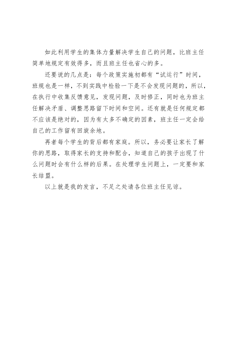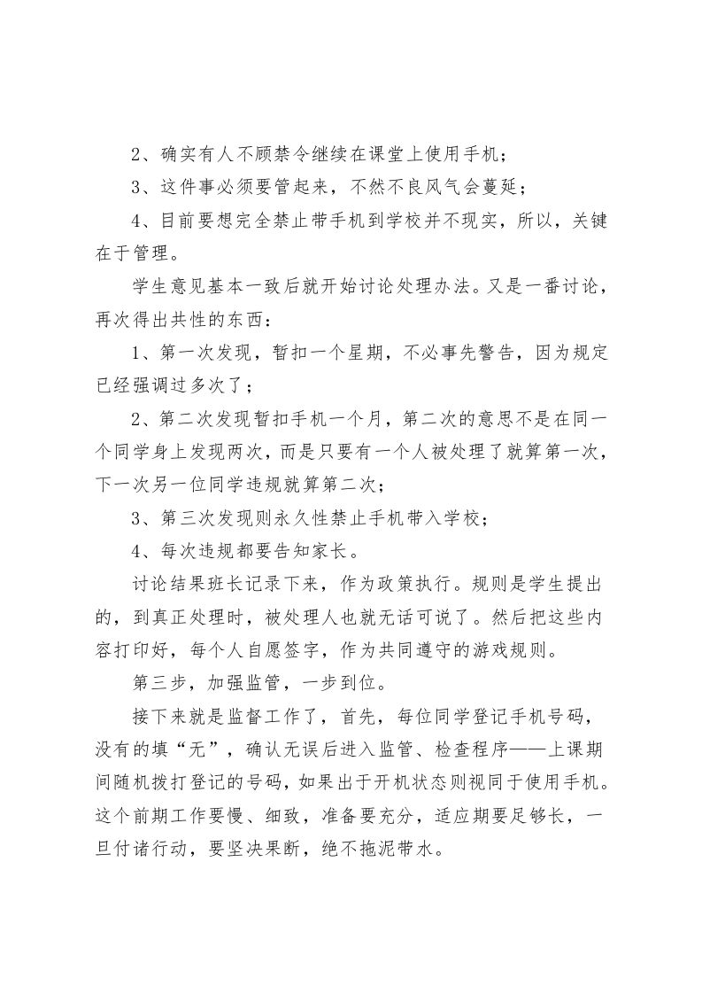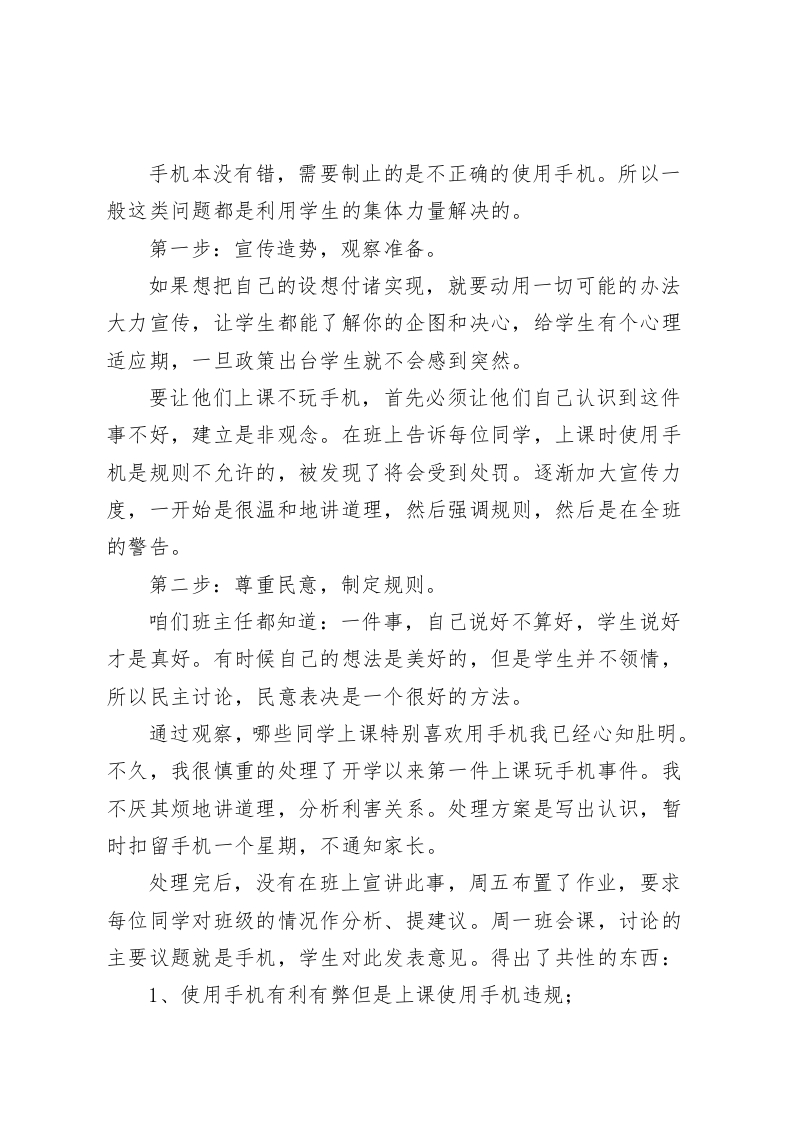 校长在班主任会议上讲话,针对手机管理问题,用自己曾经当班主任的经验与大家交流尊敬的各位班主任老师:大家好!今天我们抽这个时间召开班主任会议,主要是为了针对学生使用手机问题。班主任工作千头万绪,自从我曾经担任班主任的工作经验来看,我深深的感受到:当一名教师不容易,当一名班主任更不容易,当一名好班主任那是更更不容易了。现在我就班门弄斧把我曾经担任班主任期间的一些心得说出来跟大家交流一下,互相学习,互相促进。希望能促进各位班主任的管理工作。学生使用手机问题屡禁不止,其实说白了,我们的工作方向出现了偏差,最好的方法还是得利用学生的集体力量解决学生自己的问题。学生带手机进入学校是普遍现象。关于学生手机的管理问题也是我们班主任比较关注和头疼的问题,最简单的做法就是在班上宣布一下,所有人一律不准带手机,如果发现了,就没收。其实,这样宣布完了就没事了,学生仍然在用,发现了,第一次警告,第二次没收,最后还要还给本人或家长。最大的问题是被发现而受到处罚的学生只是认为自己的运气不好,从没有想过是自己违反规则,没有从根本上认识到不应该这样做。