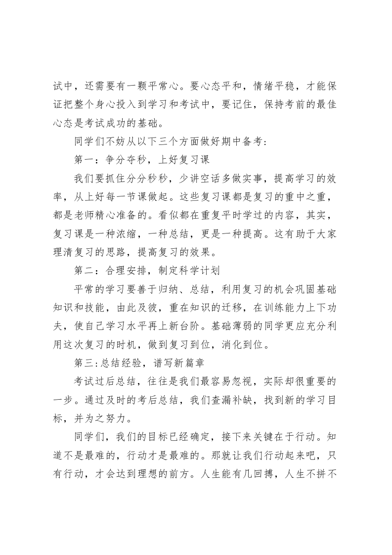 校长在国旗下演讲争分夺秒,冲刺期中尊敬的各位老师,亲爱的同学:经过两个多月紧张的学习生活,我们即将迎来对我们学习成果的一次大检阅:期中考试。这对于我们来说是这学期的第一次大考,许多同学可能会紧张、担心,甚至烦恼。因为你心中的梦想是那么美好,父母对你的期望是那么殷切,而你又是那么想考出好成绩,让父母高兴,让老师自豪,那我们应该从哪些地方做起呢?同学们,优秀的成绩来自勤奋的学习!来自我们为了心中的理想而刻苦学习的执着!首先,我们要以积极的心态备考,全力以赴,用辛勤的劳动和科学的方法去迎接挑战。考试的正常发挥,很大程度上在于我们的心态。与其说去应付考试,不如说去迎接考试:与其说是检测自己,不如说是提高自己。通过考试,每一位同学都可以找到自己在学习中存在的不足,自己的学习方法是否得当等等,以便在今后的学习中做适当的调整,因此,同学们一定要以正确的态度认真对待期中考试,把握这次机会,充分展示自己的才华和智慧。其次,良好的心态是成功的一半。有很多学生,在考试前,还没有上考场就紧张的不行,到考场后,以前复习得很好的知识一下子都忘了,很多题也好像不会做了,这时我们要相信自己完全能够做好,相信成功就在不远的前方。我们一定要多激发自己,要知道有"有志者、事竟成"的道理。同时,在复习考