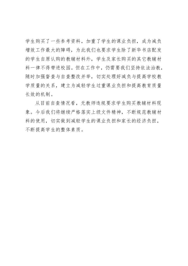 学校教辅资料自查报告根据教辅材料使用管理工作的通知要求,端正办学思想,规范办学行为,办好人民满意教育,我校先后召开行政会、教职工会,学习、领会通知精神,并随后认真进行了自查自纠,现将对教辅材料的使用、管理等方面的自查自纠情况报告如下:一、我校学生所使用的教学用书均为省教育厅和市教育局公布的中小学教学用书目录中的书目。二、教辅材料的选购严格坚持自愿选购原则,目前所有教辅材料都是在市教育局有关部门和教研室指导下由学生自愿征订购买。三、我校严格实行教辅材料“一科一辅”制度,各科教辅资料先报教务处审核,最终经主管领导签字同意后学校统一做好无偿代购服务,无从中牟利行为。四、我校从不组织学生统一购买规定之外的学生用书,从不向学生推荐各类教辅材料,教师也没有采取布置作业、集体讲解等形式变相推销资料。教师教学和布置作业均采用教师自己编制的导学案和测试题等形式进行。五、加强了对教师的管理,对违犯教辅资料管理规定的教师,采取“一票否决”的办法予以处理,年度考核时视情节轻重直接定为基本合格和不合格。六、由于部分家长一味追求学生成绩,不讲求科学的教育方法。在要求孩子完成学校布置的适量作业之余,又盲目的给