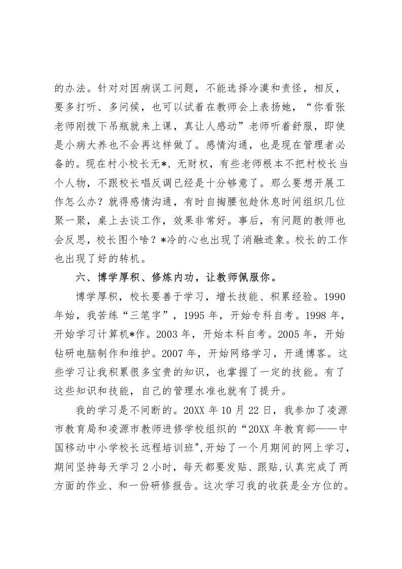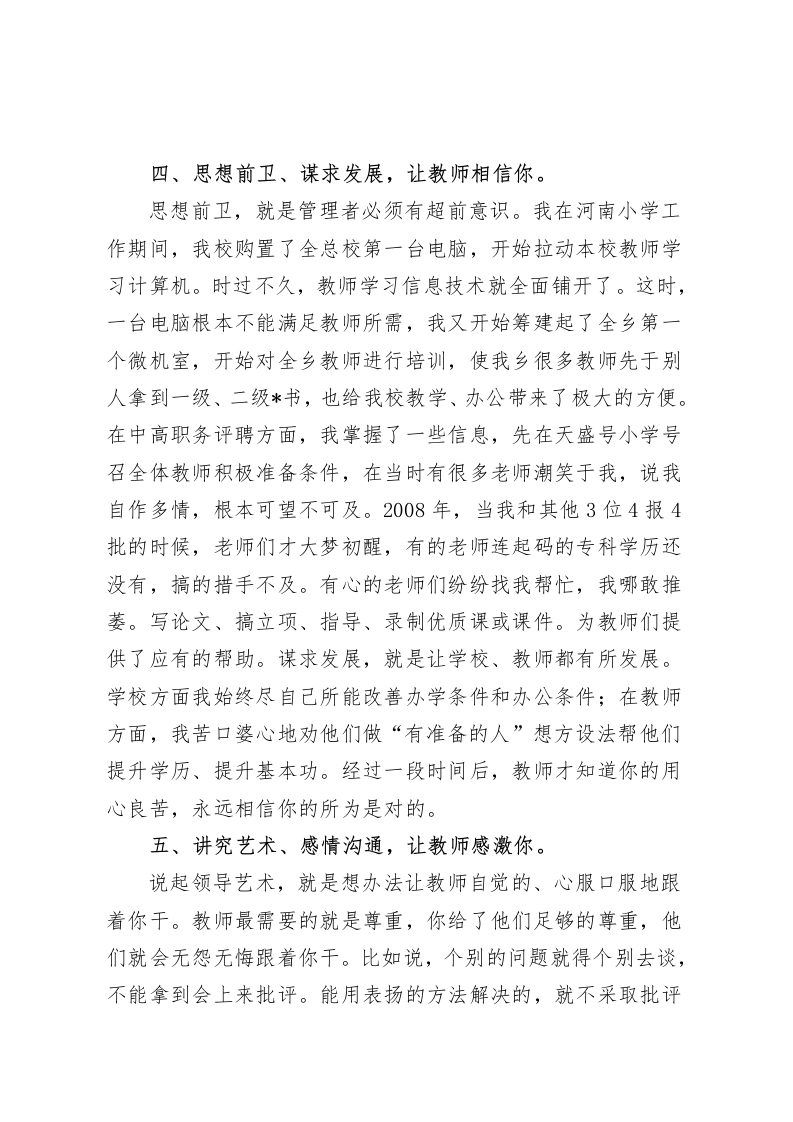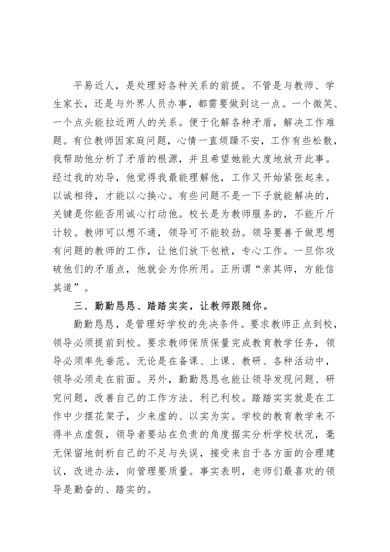 校长在学校管理经验交流会上讲话纸上得来终觉浅,绝知此事要躬行尊敬的中心校领导、各位同事大家好!今天坐在这里,和大家一起交流学校管理经验,我真不知道说什么好,原因是我没有积累多少可用来交流的经验。只能把十几年来所做、所得和所感向大家汇报一下。主要有以下六点:一、公正公平、为人朴实,让教师敬重你。公正公平,是一个村小校长最难做到的。无论是在任命班主任、分配课程,还是在考核评价、荣誉奖励面前,有时校长很难吃得准。这方面我是这样做的,比如安排班主任和课程分配上,我始终做到教师个人的想法与学校整体安排相结合,在教师个人利益受到冲突时,教师必须牺牲个人利益服从集体。另外,不能厚此薄彼,照顾自己的亲属和朋友,相反要把最困难的工作尽量安排在他们身上,这样,在其他教师眼里,就会觉得这个校长还算公平。在天盛号工作期间,那里有很多教师是我的家族或亲属,他们理所当然多担重任,少拿荣誉。为人朴实,也很重要。校长不要摆架子,从言谈举止到工作、生活都要和教师一样普普通通。让教师们感到你就是他们朋友中的一个,这也是赢得教师敬重的一个方面。二、平易近人、以诚相待,让教师亲近你。