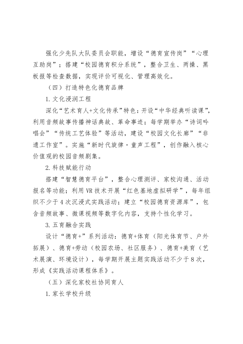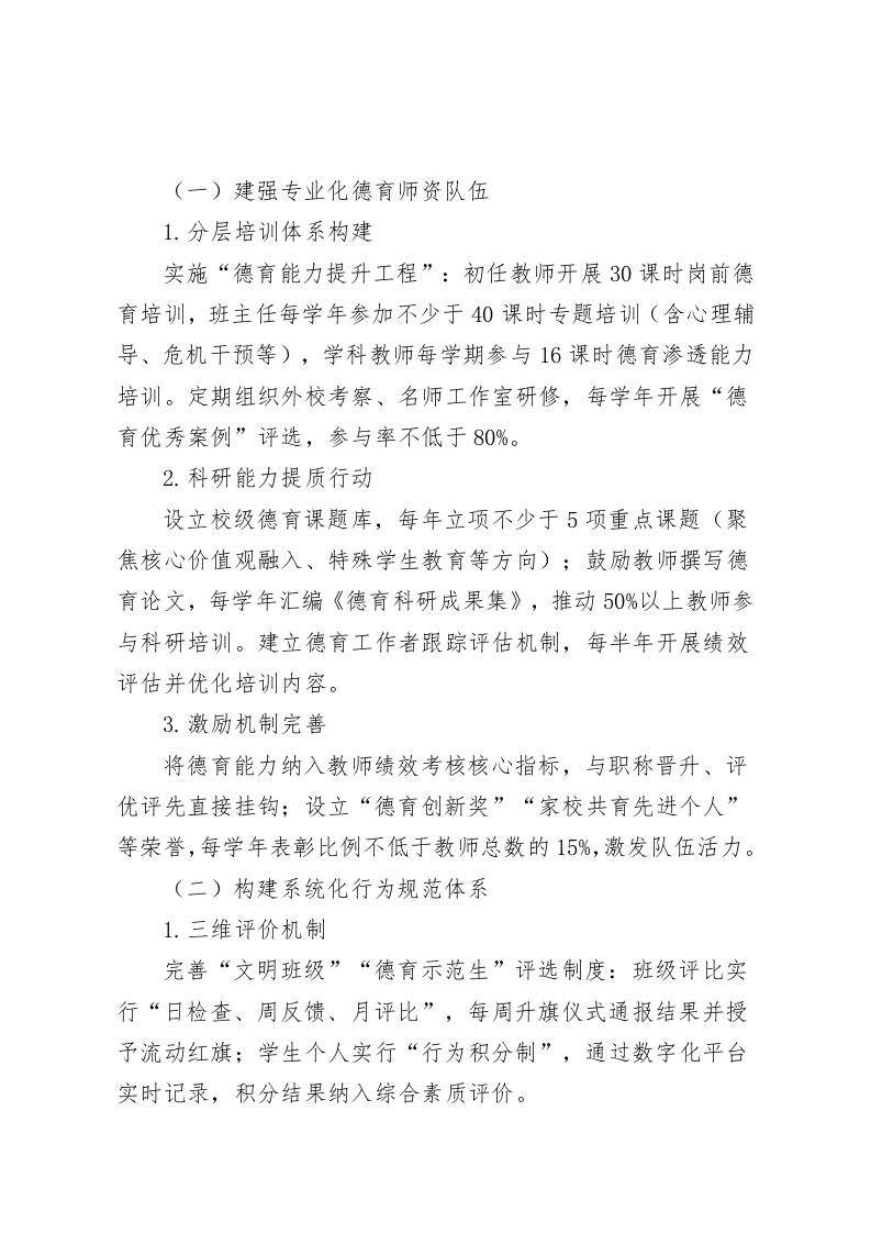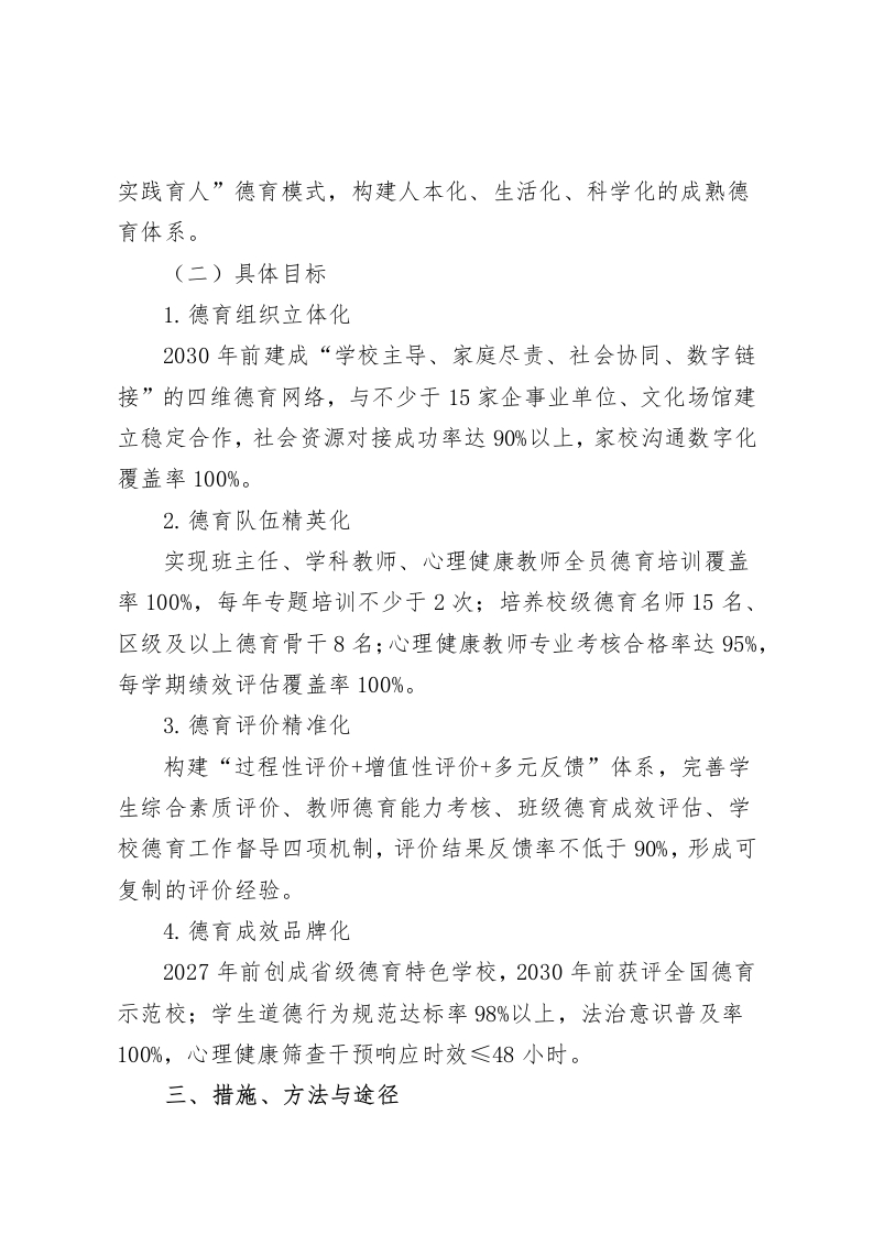 学校德育工作“十五五”规划(2025.9一2030.9)为全面深化新时代学校德育改革,落实立德树人根本任务,促进青少年学生德智体美劳全面发展,根据《中小学德育工作指南(2025年版)》、中共中央国务院《关于构建优质均衡的基本公共教育服务体系的意见》及省市区未成年人思想道德建设最新部署,结合我校发展实际,制定本规划。一、指导思想以习近平新时代中国特色社会主义思想为指导,全面贯彻党的教育方针,坚持社会主义办学方向,以社会主义核心价值观为引领,紧扣“十五五”时期教育高质量发展要求,遵循学生身心发展规律与认知特点,构建“全员育人、全程育人、全方位育人”体系。聚焦理想信念教育、爱国主义教育、品德修养教育、法治教育与心理健康教育,创新德育方法与载体,强化家校社协同育人合力,培养具有家国情怀、社会责任感、创新精神与实践能力的社会主义建设者和接班人。二、主要目标(一)总体目标经过五年系统建设,全面建成“管理精细化、队伍专业化、内容体系化、载体数字化、评价科学化”的德育工作新格局,实现教育、教学、科研、管理与服务的德育职能深度融合。打造国家级平安校园、全国德育示范校、省级文明校园与家校社协同育人样板校,形成具有本校特色的“文化浸润+科技赋能+