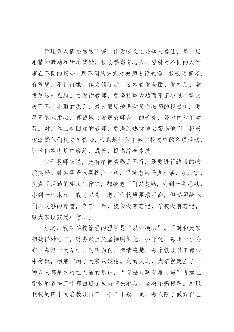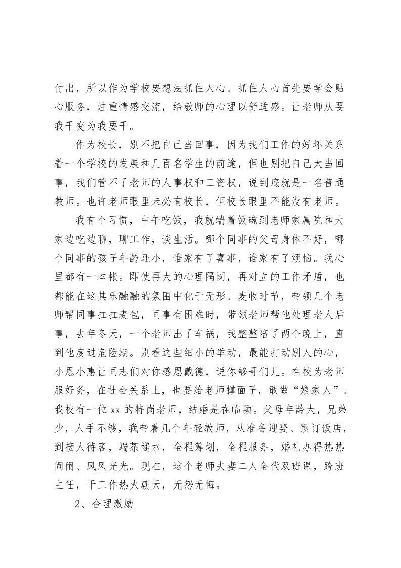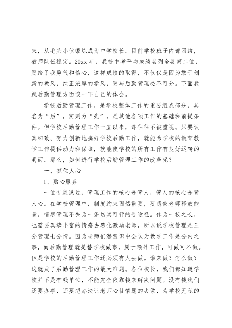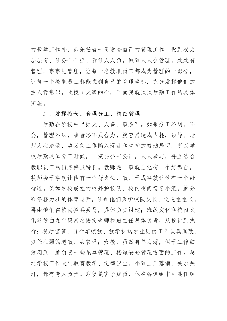 学校后勤工作经验交流分享会,校长讲话层分工和精细管理,用其所长,有效的发挥了老师的自觉能动性和创造性,焕发了他们的工作热情各位领导,同志们:大家好!我叫xx,现任xx校长,党支部书记。今天我在这里发言,内心很惶恐,很忐忑,在座的有学富五车、博古通今的教育管理专家,有德高望重、经验丰富,具有强大人格魅力的教育前辈,也有朝气蓬勃、锐意进取,敢为天下先的后起之秀,我真有点战战兢兢、不知所措。作为一名普通的农村中学校长,论成绩,我不是对手,谈方法,我不敢接招,论资历,更无从谈起,但受局领导委派来和大家交流思想、交流方法、共同学习、共同提高,我也只是勉为其难,知无不言、言无不尽,望大家批评指正。我从20xx年到任校长,已干了七年,七年中有成绩也有失误,又高兴也有烦恼,有激情澎湃也有意志消沉,领导不满意要受批评,老师不满意要受抱怨,家长不满意直接骂娘,再加上千奇百怪、繁杂无序的周边关系、社会影响、历史问题,可预料的、不可预料的、有能力解决的、没有能力解决的,你都要小着架子,陪着笑脸、恭恭敬敬说好话,耐心细致做解释,真可谓两眼一睁,忙到熄灯。其中坎坎坷坷、起起落落、喜怒哀乐、苦辣酸甜,我想在座的各位都深有同感,好在有上级各位领导的亲切关怀,有全校老师的大力支持,让我一直坚持下