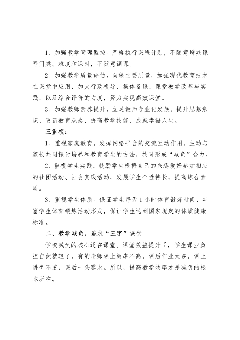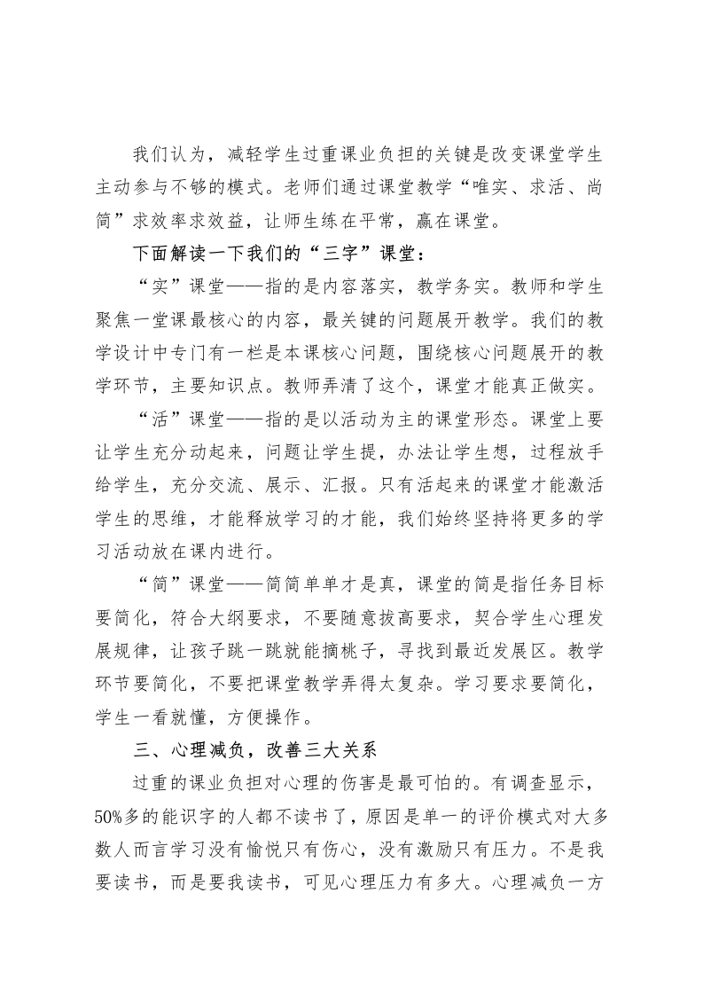 学校减负工作,校长汇报减负增效,和谐发展各位领导、同仁:欢迎大家走进学校检查减负工作。中小学课业负担和学业负担过重由来已久。前不久教育部出台了《减负三十条》,陈宝生部长也多次强调减负工作的重要性,要多管齐下,要对每一个学生的健康负责,减负不落实,学生不高兴,学生不高兴宝宝就不高兴,宝宝不高兴,后果很严重。我们学校由来重视学生过重课业负担和学业负担的减轻工作,从三个方面抓实减负:一、管理减负,落实“三三”宣言学校将以减轻学生课业负担为己任,以提高学生综合素质为根本,以“成就学生快乐童年、成就教师幸福人生、成就学校可持续性发展”为目标,真正实现“减负增效、和谐发展”。为此,我们将在管理工作中落实三个“三”:三控制:1、控制学生在校时间,把更多的时间空间还给学生。2、控制学生作业总量。一、二年级不布置书面家庭作业,其他年级书面作业量不超过1小时,并针对重点、难点、易疏漏的学习内容布置作业,注意不同学生的作业练习需求。3、控制学生考试次数。学生每学期只进行一次期末学科考试,学业成绩实行等级制。三加强: