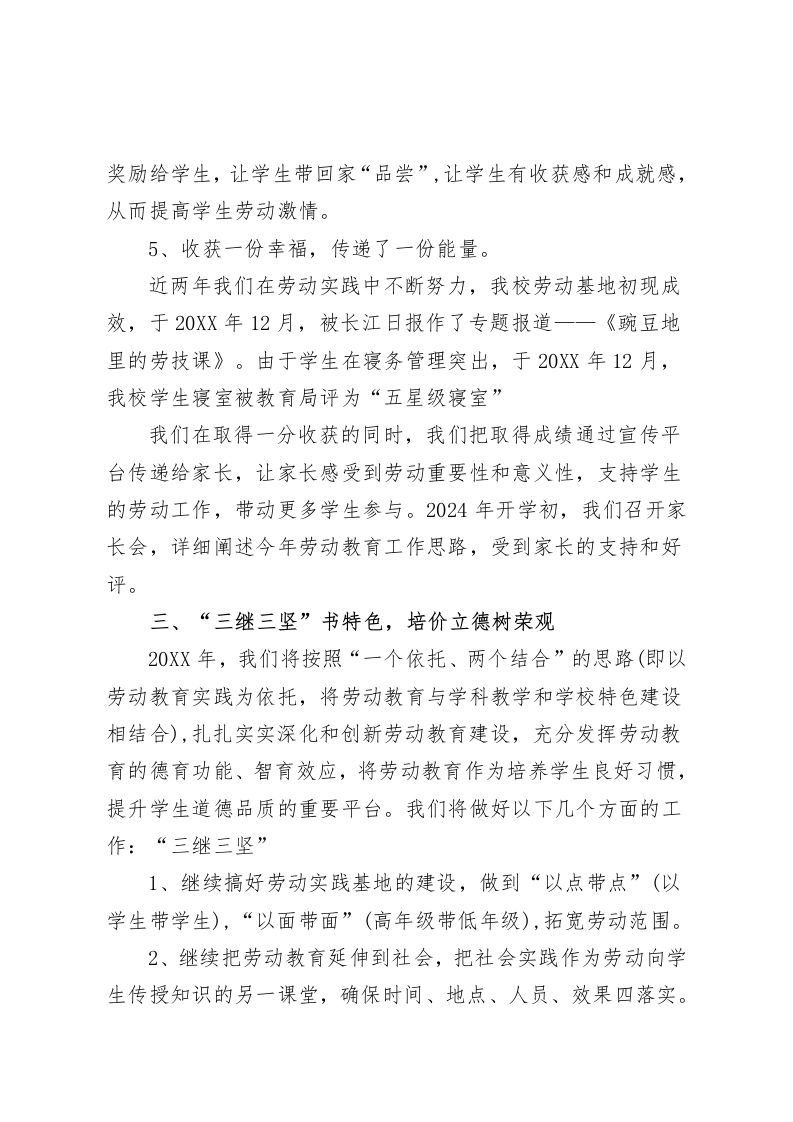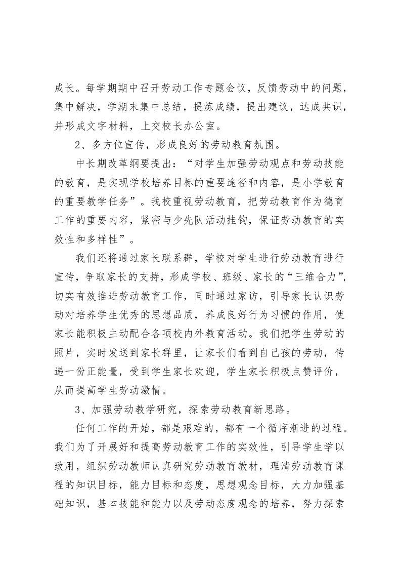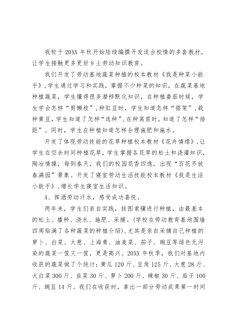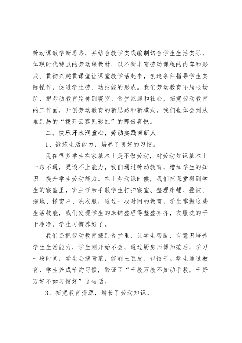 学校劳动教育工作经验交流,校长汇报拓宽劳动教育渠道,培养学生劳动技能为了贯彻区教育局关于做好农村中小学寄宿制学校劳动教育建设意见的通知的文件精神,同时进一步提高我校办学品味和办学特色,20XX年初秋,我校以陶行知先生的教育思想为指导,以学生实践能力的培养为特色目标,针对孩子在自然、社会、生活方面的认识局限性和动手能力不足,以劳动技能和生活技能为切入口,创造性地把课堂教学和劳动实践紧密结合起来,把孩子带进田间和生活,让学生掌握劳动知识,体验劳动的过程和乐趣。通过劳动实践活动,来提高学生的实践能力和综合素质、让学生形成良好劳动品德,让学生在实践中获取劳动真知,从而促进学生的向知情意行健康有序的发展。一、教内活外互相长,拓宽思路创实效1、强化教育意识,达成劳动教育的共识。为了更好地领导开展学校劳动教育实践活动,开发教育资源,让学生有全面发展的机会,学校组织成立了以校长为组长的劳动教育工作领导小组和以教学校长劳动教育业务指导小组暨以后勤校长劳动教育保障小组。每学期制定了详实可行劳动教育工作计划,并选派有劳动技能老师担任劳动实践指导老师。老师学生一起干,全员参与,分工合作,老师教学生,学生教学生,互帮互学,形成“教”“活”相长,“内”“外”互补的意识,营造劳动实践氛围,让大家在劳动中快乐,在快乐中