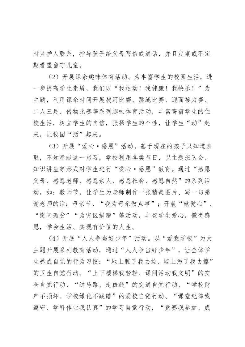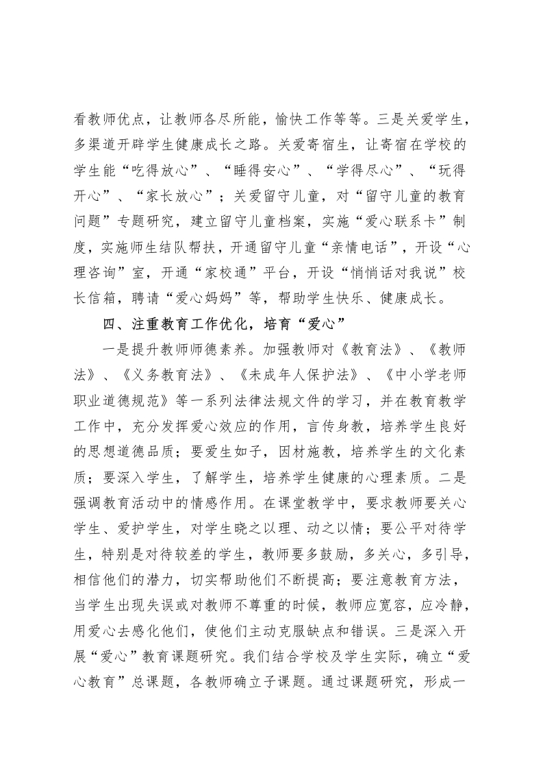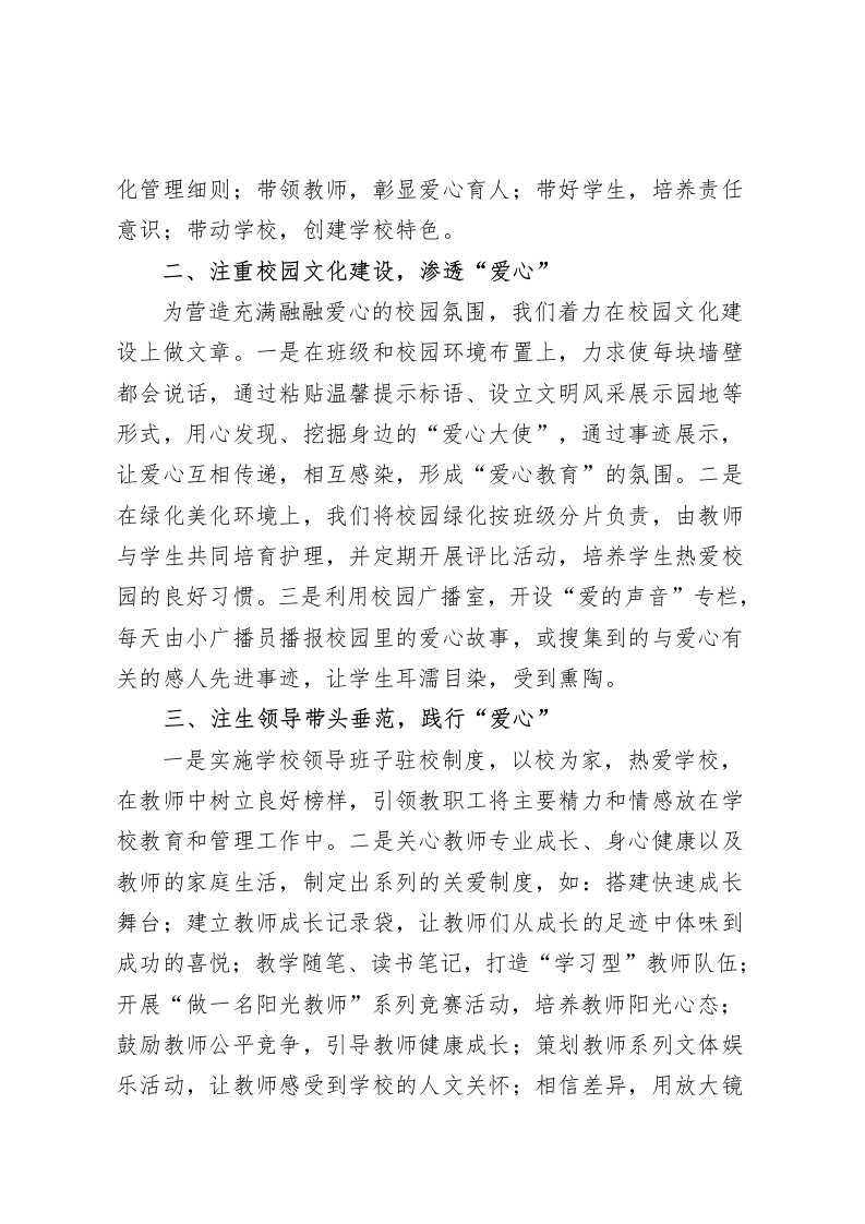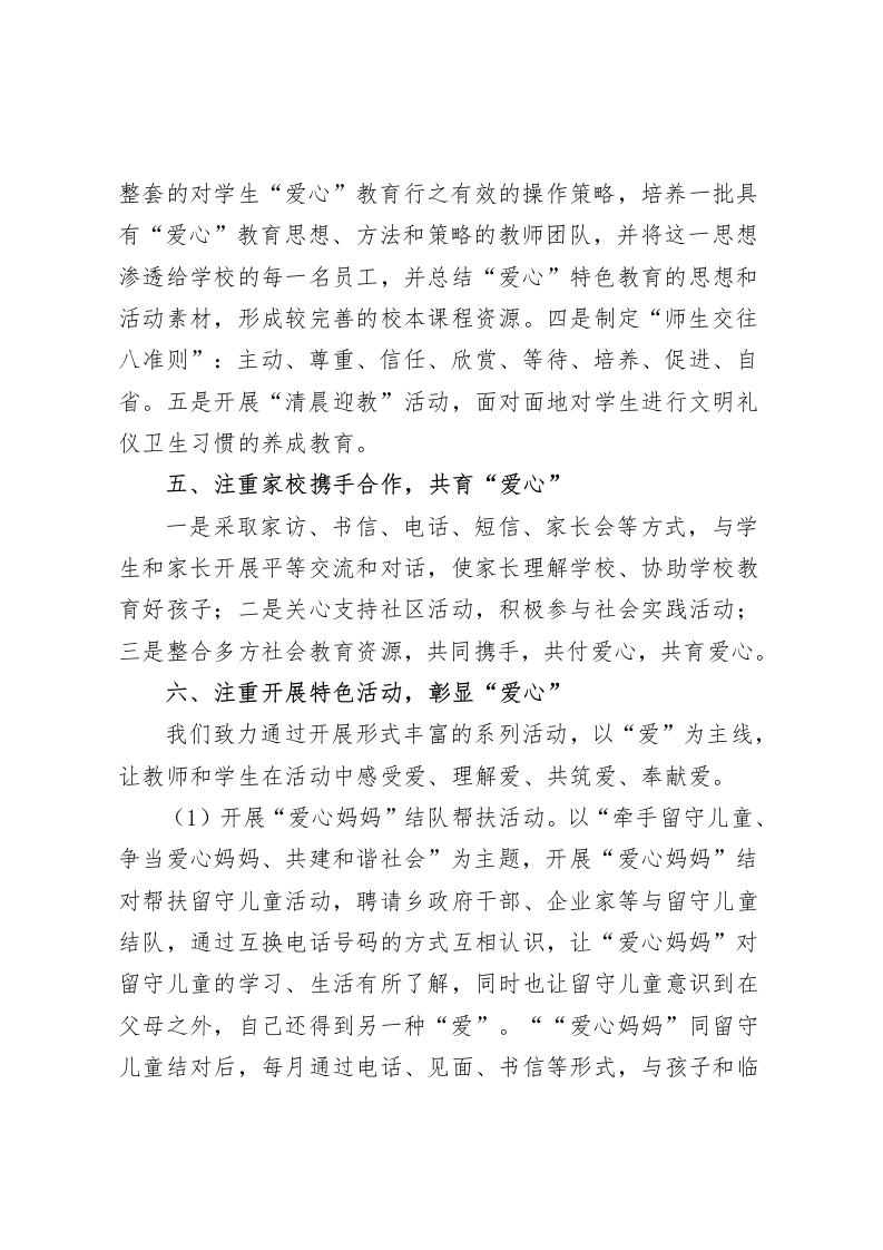 学校特色,亮点汇报用心抚育幼苗,让爱注满校园各位领导,你们好:xx学校占地17388平方米、建筑面积7182平方米,绿化面积10310平方米。学校共设九个教学班,有在校学生四百余人,地处偏远的Xx九年制学校明显呈现出寄宿学生为主、留守儿童多等特征。为了让学生在学校学得舒心、让家长放心,同时让教职工在相对边远艰苦的条件下工作得安心,学校提出“爱心学校”定位,以陶行知“爱满天下”的教育思想为指导,在“播撒爱心·构建和谐·快乐成长”的办学理念指引下,致力构建“充满文化的校园、充满爱心的教育、充满欢乐的学生”的特色学校。th九年制学校着力从以下几方面构建“爱心学校”办学特色,实现教师专业发展、学生快乐成长。一、注重强化制度保障,凸显“爱心”学校确定“以人为本,以爱育爱”的办学思想,同时学校重点提出三个“关注”:一是关注教师超常发展,在机制上注重优秀教师的奖励,评优评先、进城考核机会倾斜,体制上实现教师专业提升、骨干培训及保障;二是关注学生健康发展,以课程实施、教学质量提升、系列“爱心”活动来实现学生全面发展;三是关注学校特色发展,强化校园环境建设、塑造校园文化、突显教学办学特色。为确保朝着既定的办学特色方向发展,学校还制定了“四带头”办学举措,即:带头管理,深
