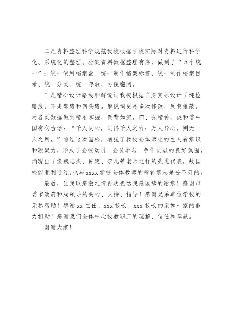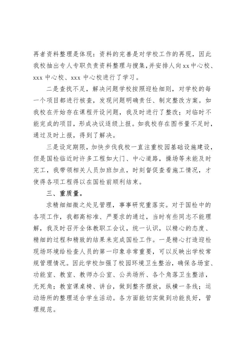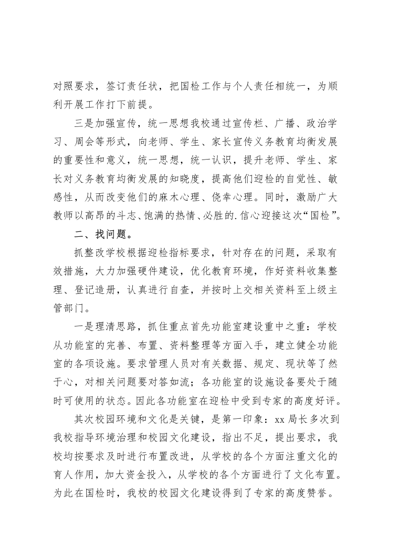 义务教育优质均衡迎国检,先进学校校长讲话建组织,找问题,重质量尊敬的各位领导、各位校长、各位教育同仁:大家好!今天,我作为教育均衡发展先进单位的代表在这里发言,深感荣幸!在这里首先感谢支持我校发展的各级领导的关怀:感谢兄弟单位的鼎力相助:感谢我校全体师生的共同努力。没有大家的帮助,我校的迎检工作就不会取得这样的成绩。去年的11月,我曾作为迎检中的后进单位在这里做过表态发言,知耻而后勇,压力与责任并存,回去以后我带领我的团队认真反思,深入研究,查找问题,狠抓整改。我校有幸被抽中,是对我和我校的一次考验,但我们更把它看做是我们的一次机遇,是我们洗辱的机会。因此我校全体师生能够同心同德,齐心协力的去完成迎国检工作,现汇报如下:一、建组织。明分工一是成立小组,明确分工我校及时成立了以我为组长的迎国检工作领导小组,统一思想,明确任务。另外成立了以分管领导为组长的环境整治组、文化建设组、卫生督查组、资料整理组、检查督导组五个小组,分工明确,扎实有效的开展迎检的各项工作。二是定下了目标,落实了责任我带领班子多次召开会议,认真学习义务教育均衡发展方面的有关文件和迎国检工作指南,
