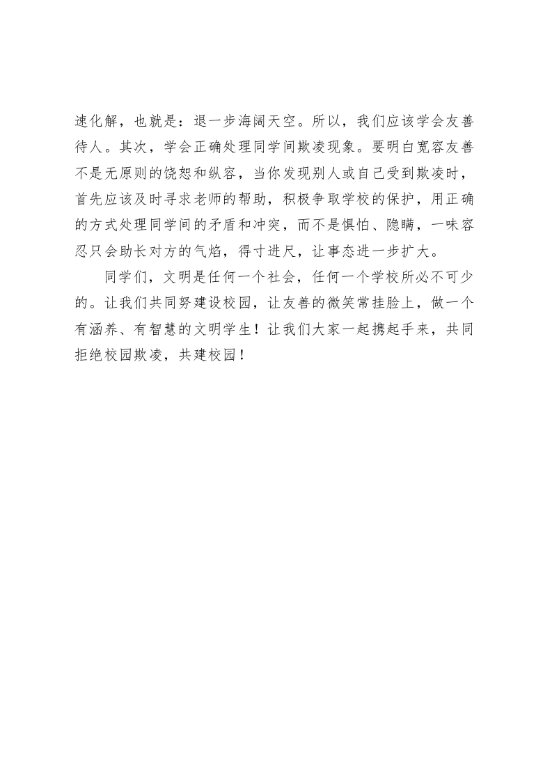 预防校园欺凌,校长国旗下讲话让我们共同努建设校园,让友善的微笑常挂脸上,做一个有涵养、有智慧的文明学生各位老师、同学们:大家上午好!今天我在国旗下讲话的题目是反对“校园欺凌,共建校园”。什么是校园欺凌。所谓校园欺凌"就是同学间欺负弱小、言语羞辱及敲诈勒索甚至殴打的行为等。如向低年级学生索取钱物,不给就打,两个同学发生小矛盾,找高年级学生帮忙等等。一旦发生这样的事情,它不但会使同学的身体受到伤害,更有可能会对他造成心理影,严重时还会威胁他的生命。如今的社会上呢,时不时会听说有关校园欺凌的事情,实际上,大多数校园欺凌事件的起因都只是一点点的小事,有的甚至并没有什么直接原因。通常是打饭队、上下楼梯不按道走、无意碰撞、出言不逊、别人一个无意的眼神等等微不足道的小事,应该说,在人与人相处的过程中,发生一些小摩擦是难免的。作为学生的我们,如何做好防范呢?首先,要学会宽容。宽容就是人与人之间相处时能充分的理解他人、体谅他人,拥有宽阔的胸怀。同学们生活在一起是一种缘分,万一产生一点摩擦要学会说:[对不起"。我们千万不要小看这三个字,它的作用很大,在处理同学关系时有着出奇的效果。但是矛盾发生后,应该学会包容、体谅他人,不能斤斤计较,应该让矛盾迅