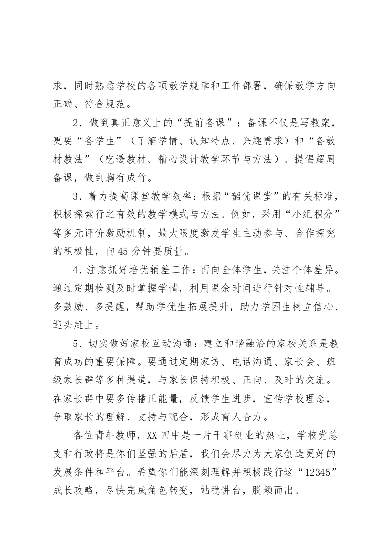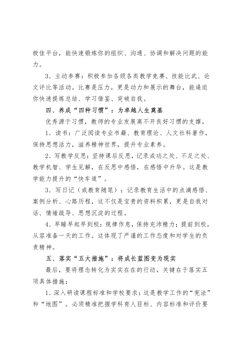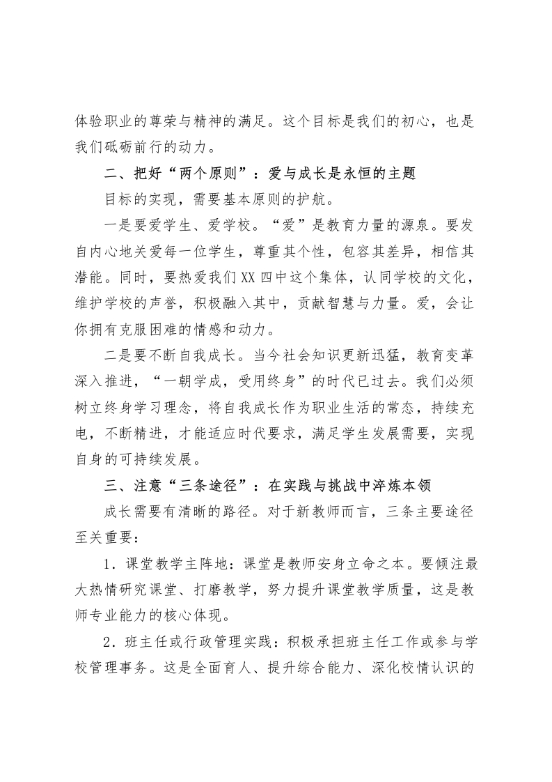 在x四中新教师业务培训会上的讲话:新教师成长的12345各位新入职及入职五年内的老师们:大家好!今天能和大家齐聚一堂,共同探讨教师成长之路,我既欣慰又期待。你们是XX四中注入的新鲜血液,是学校未来发展的中坚力量,你们的成长不仅关乎个人职业理想的实现,更直接影响着每一位学生的未来,承载着学校的希望。今天,我想围绕“新教师成长的12345”,和大家分享一些实践方向与心得,希望能为大家的职业起步与进阶提供助力。一、坚定“一个目标”:做抬得起头、挺得起腰的幸福良师教育的根本在于立德树人。作为新时代的人民教师,我们首先要锚定自己的人生坐标和职业航向。这个目标就是:努力成长为一名抬得起头、挺得起腰、让学生爱戴、且自己内心幸福充盈的好老师。“抬得起头、挺得起腰”意味着我们要有高尚的师德师风,有扎实的知识功底,有教书育人的底气与自信,言行世范,无愧于心。“让学生爱戴”要求我们不仅传授知识,更要用真诚的关爱、人格的魅力去感染学生,成为他们成长路上的引路人和知心朋友。“自己幸福”提醒我们,教育是生命影响生命的美好事业。我们要从学生的进步中、从自身的成长中、从对教育的奉献中