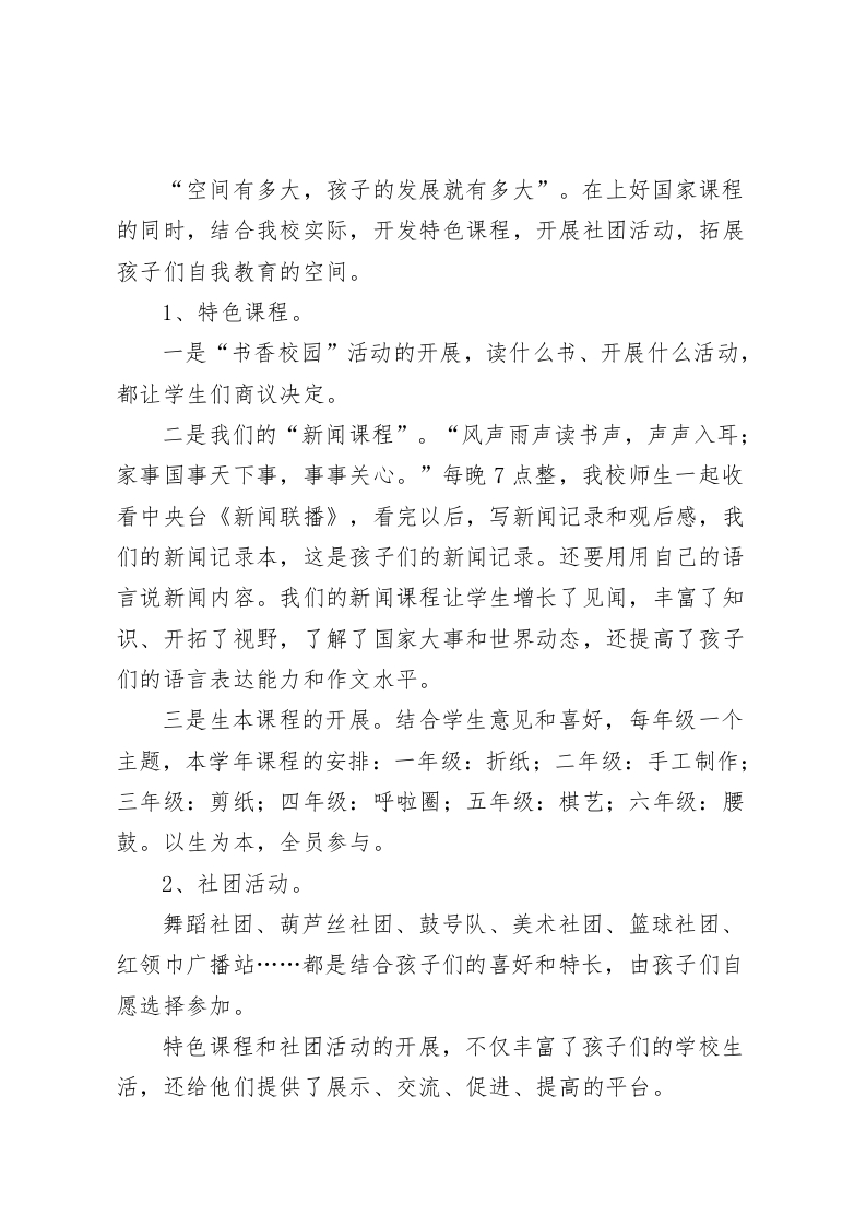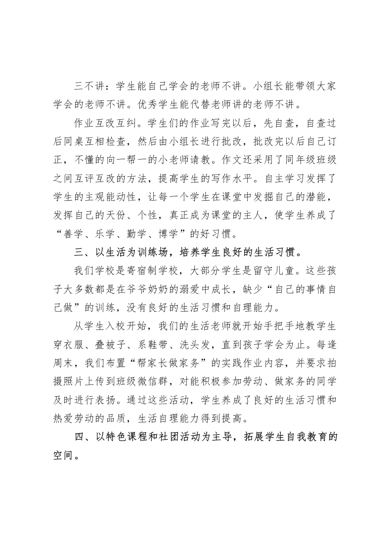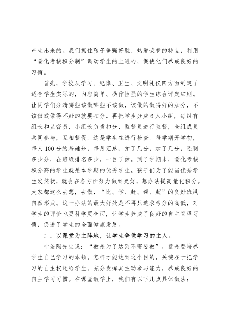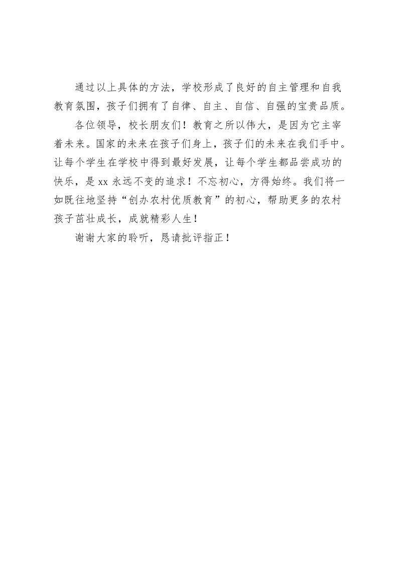 中小学校长论坛,校长发言培养自主管理习惯,促进学生自我成长尊敬的各位领导、校长朋友们:大家好!我是Xx县xx学校的校长Xx。Xx学校位于Xx乡,创办于Xx年,是一所寄宿制小学,现有24个教学班,在校生1164人,教职工90余人。今天我汇报的主题是:培养自主管理习惯,促进学生自我成长。Xx学校的办学宗旨是创办农村优质学校,让农村孩子享受优质教育。优质不仅仅指条件优、成绩优,还包含对学生道德品质的培养和良好习惯的养成。为了培养学生的自主管理能力,我校为学生创造各种平台和机会,使每一个学生能够得到锻炼,实现自我管理和自我教育。接下来,我从以下四个方面向大家汇报我校学生自主管理的一些具体做法。一、以学生为主体,让学生做好自管自律。学生会、班级岗位负责制、学生个人量化考核积分制是我们在学生自管自律方面采用的方法。对学生会和班级岗位负责制大家都很了解,也有很多学校在用,今天我就不再详说。我想重点说一下我校的学生个人量化考核积分制。到了学期末,每个学校都会评选优秀学生,小学的优秀学生大部分都是老师定的。我们学校的优秀学生不是班主任选的,也不是同学们投票选的,是通过每班的《学生量化考核积分表》