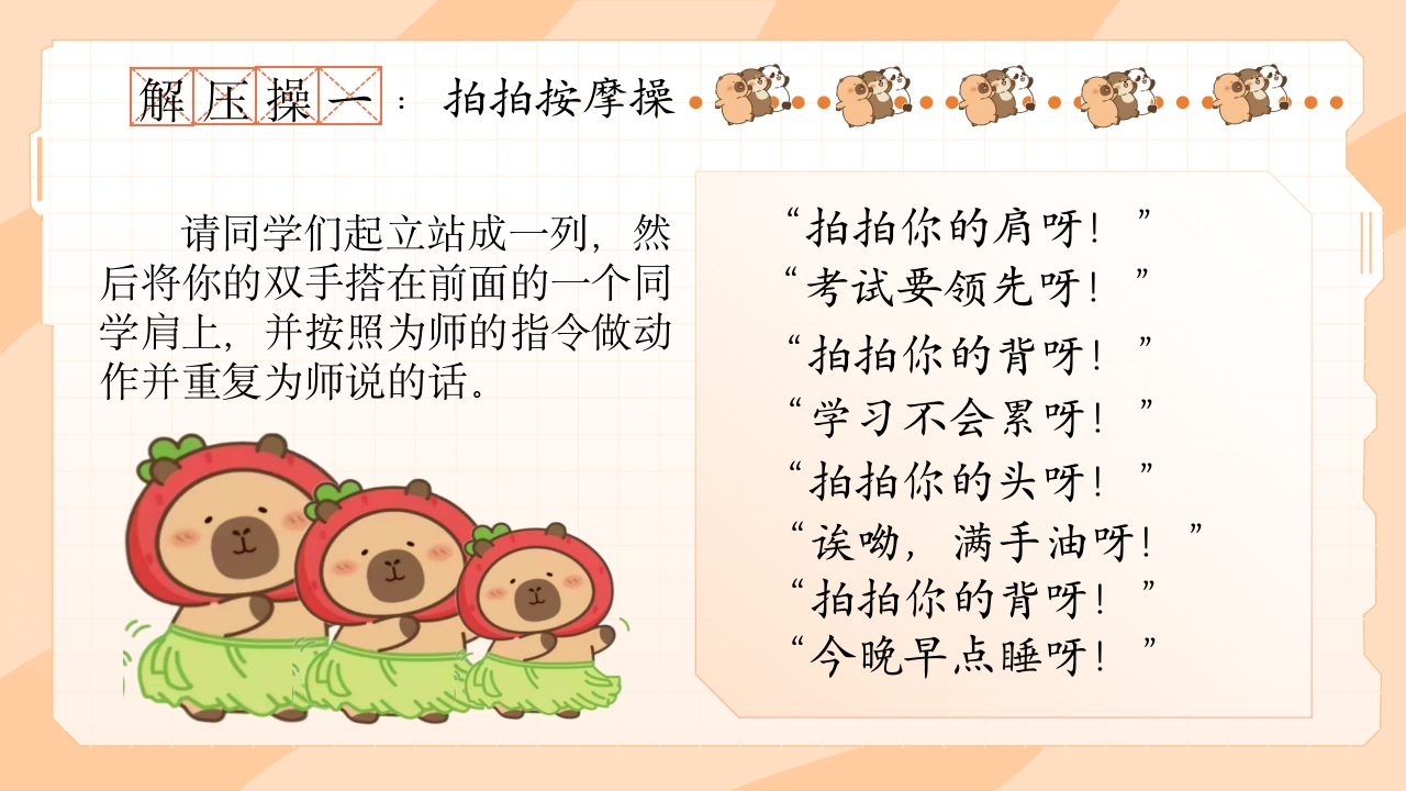【初高中】【考前解压】主题班会:豚门放松解压秘籍tangqi888小时前发布关注私信77.01MB49页0408 第1页 / 共49页 第2页 / 共49页 第3页 / 共49页 第4页 / 共49页 第5页 / 共49页 试读已结束,还剩44页,您可下载完整版后进行离线阅读 【初高中】【考前解压】主题班会:豚门放松解压秘籍此内容为付费资源,请付费后查看¥9.9¥19.9VIP会员免费立即购买您当前未登录!建议登陆后购买,可保存购买订单付费资源© 版权声明本站是一个信息分享及获取的平台,不确保部分用户上传资料的来源及知识产权归属,资料由老师投稿,公开渠道整理,网友上传,如果侵犯到您的权益,请联系客服删除THE ENDPPT课件 文本预览 豚门宝典放松解压秘榜考前放松解压秘籍 查看更多 收起部分 喜欢就支持一下吧点赞8 分享QQ空间微博QQ好友海报分享复制链接收藏