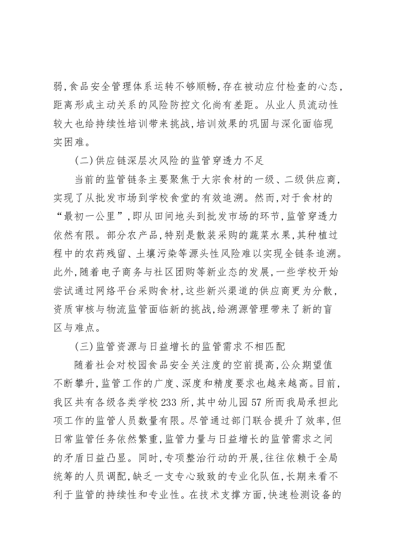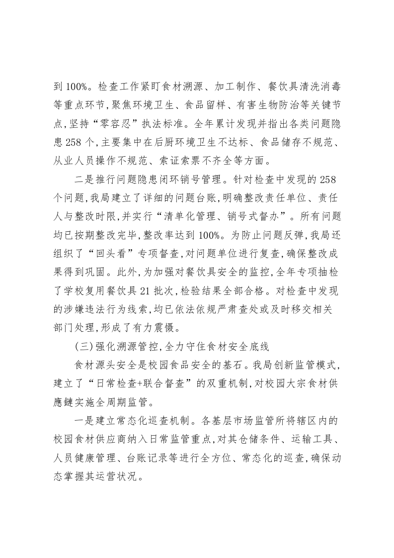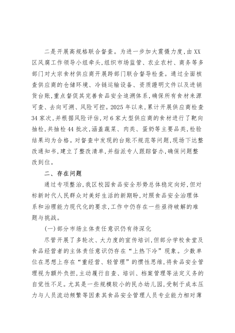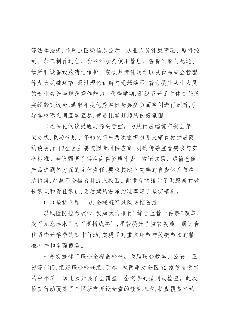 XX市市场监督管理局XX区分局2025年度校园食品安全专项整治工作总结(精品)为深入贯彻落实食品安全“四个最严”要求,切实保障广大师生“舌尖上的安全”,根据年度工作部署,XX市市场监督管理局XX区分局于2025年1月至11月,在全区范围内组织开展了校园食品安全专项整治行动。本次行动聚焦“校园餐”全链条、全方位、全过程监管,以压实责任为基础,以消除风险为核心,以源头治理为关键,取得了阶段性成效。现将有关工作情况总结如下。一、基本情况2025年以来,我局始终将校园食品安全置于监管工作的首要位置,通过周密部署与扎实推进,构建起覆盖“供、管、食”各环节的安全保障体系,有效防范和化解了校园食品安全风险,全力护航青少年健康成长。(一)聚焦顶层设计,全面压实各方主体责任织密责任网络是保障食品安全的前提与基础。我局围绕“明责、知责、尽责”的核心目标,通过制度建设与宣传教育相结合的方式,推动校园食品安全责任体系的建立健全。一是强化制度约束与培训赋能。春季学期开学前,组织召开了全区校园食品安全工作部署会,联合教育体育等部门,对全区所有中小学、幼儿园的校(园)长及食品安全总监、安全员进行专题培训。培训内容系统涵盖了《中华人民共和国食品安全法》洲