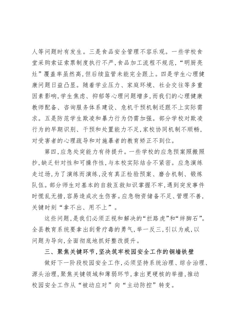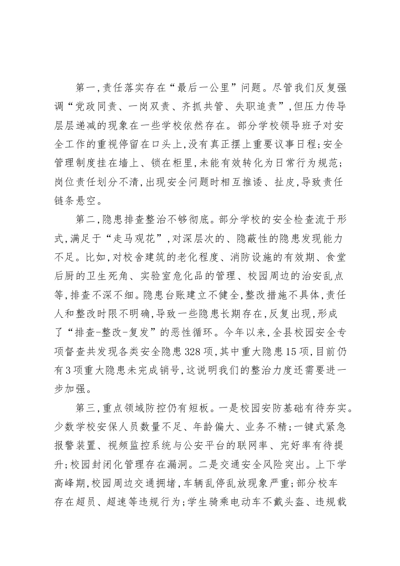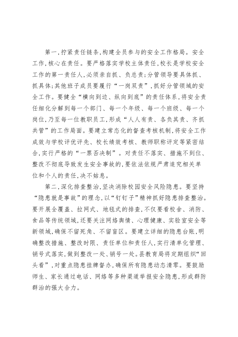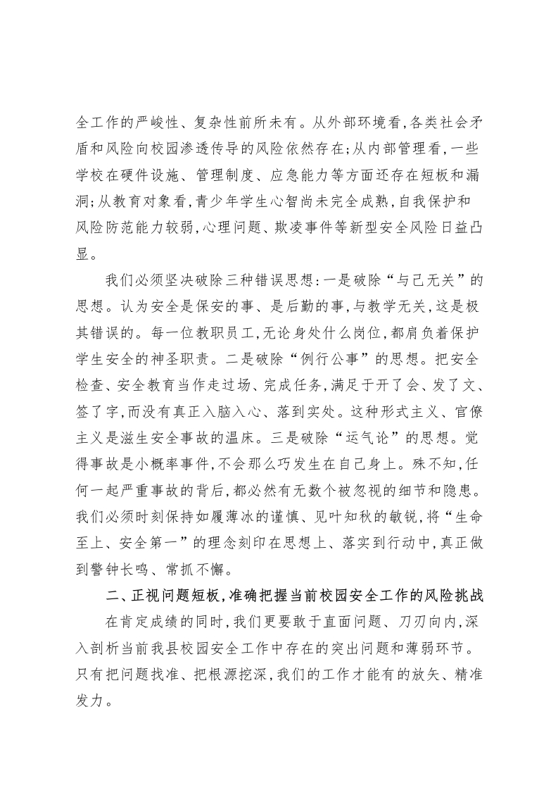 双县教育局在全县校园安全工作会议上的讲话(精品)同志们:今天,我们在这里召开全县校园安全工作会议,主要任务是深入贯彻落实习近平总书记关于安全生产的重要指示批示精神,迅速传达学习全省、全州、全县安全生产工作会议的最新部署,分析研判当前我县校园安全工作面临的形势,对下一阶段重点任务进行再强调、再部署、再推进。安全是发展的前提,是最大的民生,更是教育事业健康发展的生命线。我们必须以最高的标准、最严的要求、最实的举措,全力保障广大师生的生命安全和身心健康,为全县教育高质量发展筑牢坚实的安全屏障。下面,我讲三点意见。一、提高政治站位,深刻认识校园安全工作的极端重要性校园安全,事关万千家庭的幸福安宁,事关社会和谐稳定的大局,事关培养德智体美劳全面发展的社会主义建设者和接班人的根本任务。习近平总书记多次强调,“发展决不能以牺牲人的生命为代价,这必须作为一条不可逾越的红线”。这一重要指示,是我们做好校园安全工作的根本遵循和行动指南。全县教育系统的每一位同志,都必须从衷心拥护“两个确立”、忠诚践行“两个维护”的政治高度,深刻领会抓好校园安全的极端重要性。思想是行动的先导。当前,我县校园安全形势总体平稳,但我们绝不能因此产生丝毫的麻痹思想和松懈情绪。必须清醒地看到,随着经济社会快速发展,各类风险隐患交织叠加,校园安