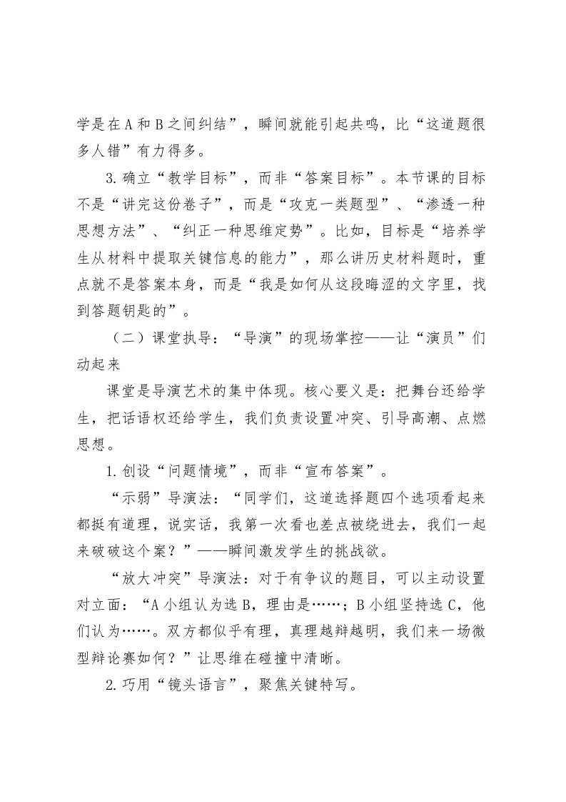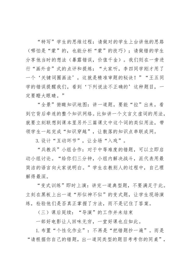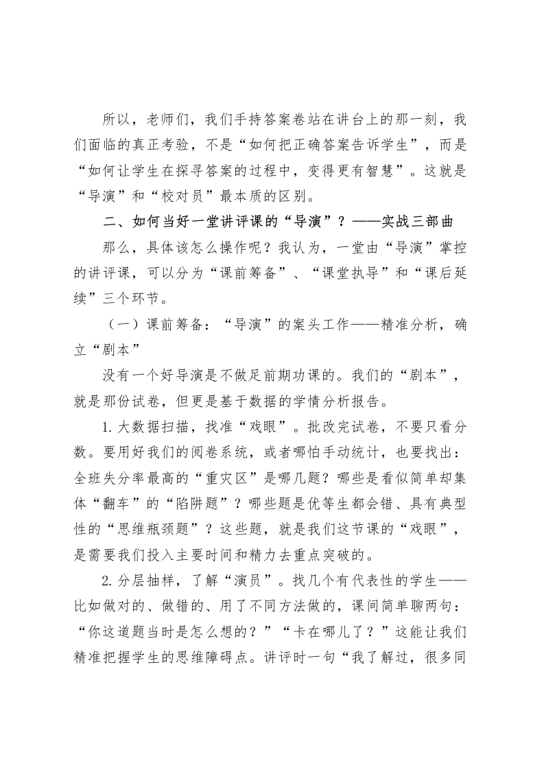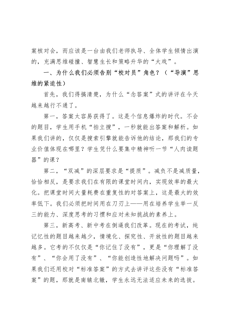 不做“校对员”,要做“导演”:如何导出一堂精彩的试卷讲评课一在教学工作会议上的讲话各位老师,同志们:大家下午好!今天我们开这个教学工作会议,我不想讲太多空泛的大道理。我们就聚焦一个每个老师每周、甚至每天都在做,但可能已经做得有些“麻木”和“惯性”的事情一一试卷讲评课。请大家先在脑海里回放一下我们常见的讲评课场景:老师拿着一份批改完的卷子,从第一题开始,一路讲到最后一题。“A选项不对,B选项是陷阱,C选项正确,为什么?因为书上有原话…下一题,张三同学这道题做错了,要注意…”台下的学生呢?做对的心不在焉,神游天外;做错的忙着抄正确答案,笔记本上红红绿绿,看似认真,但眼神里缺少了那种“亮光”。这种课,像什么?我觉得,特别像工厂流水线上的“校对员”。我们的工作,就是拿着一张标准答案,去核对哪些产品(学生)这里有个瑕疵,那里有个错误,然后贴上“正确”或“错误”的标签。我们是知识的权威发布者,是答案的最终裁定者,但唯独,不是学习的点燃者。今天,我想和大家共同探讨一个转变:从“校对员”到“导演”的转变。一堂精彩的试卷讲评课,不应该是一场枯燥的答