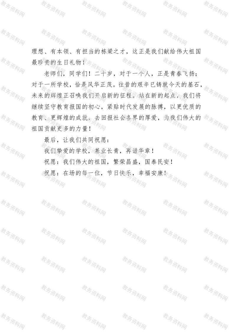 技术职业中等专业学校校长在建校20周年庆典上的发言老师们、同学们、校友们:大家上午好!双庆同辉,廿载风华筑梦未来!今天,我们不仅满怀自豪地庆祝学校二十岁的青春华诞,更无比激动地迎接我们伟大祖国七十六周年的光辉节日!此刻,站在这里,我心中涌动着的是无尽的感恩、自豪与期盼。回首二十年,是一部充满激情的创业史。2005年,学校的创办者怀着对教育的一腔赤诚,白手起家。从最初的几间简陋的教室,到如今书声琅琅的现代化校园;从第一批满怀信任的学生家长,到如今桃李遍天下的万千英才。二十年,我们走过了一条民办学校“在竞争中生存,在创新中发展”的拼搏之路!这每一步,都凝聚着创办者的远见、历任领导的心血,更离不开每一位教职员工的坚守与奉献!你们,是学校最宝贵的财富!在此,请接受我最诚挚的敬意与感谢!我们学校的二十年,更是与国家命运同频共振、共同成长的二十年。正是得益于祖国七十六年来,特别是新时代以来的繁荣稳定与蓬勃发展,才为我们提供了茁壮成长的沃土。国家的强大,为我们搭建了追逐梦想的广阔舞台;民族的复兴,赋予了我们“为党育人、为国育才”的光荣使命。我们将“爱国情怀”深深植根于教育实践,看着孩子们从懵懂少年成长为有