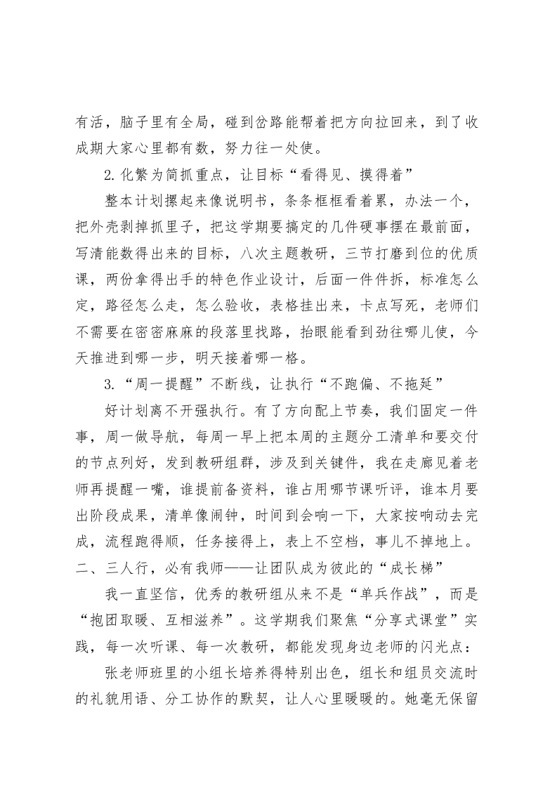 教研组长管理经验交流发言:深耕常规细水长流,凝聚微光共赴成长尊敬的各位领导、各位同仁:大家好!担任教研组长这些年,我常想,自己没有惊天动地的管理妙招,也没能带领团队做出多么耀眼的成绩。我们所做的,只是在平凡的教研路上,和老师们一起稳扎稳打、久久为功,按部就班地把每一项常规工作做深做细做透。今天,我没有“出奇制胜”的法宝,只想和大家分享几点“细水长流”的心得。一、凡事预则立,不预则废一一让计划成为前行的“导航图”没当教研组长之前,学期计划和个人计划放在电脑里,开学写一写,学期末翻一翻,像打卡,心里不当回事,真坐到这个位子,发现一张清楚的计划能把队伍拉成一股绳,谁干什么谁配合什么,一眼就明白,纸上要落成事上,得有人盯,有人跟,有人把节点捏住,按这个想法,我们做了三件事:1.计划“我们”一起定,激活“主人翁”意识我跟老师们常说,教研组不是组长的地盘,是大家一起住的屋子,像一块教研田,种什么,怎么种,哪天施肥,哪天收,不能我一句话定,全员围桌子,把图摊开,一处一处点,用手点着日历把节奏排好,谁擅长课堂结构谁去啃,谁对作业有想法谁去打样,谁盯学生管理谁去跑线,认领自己的品种,手里
