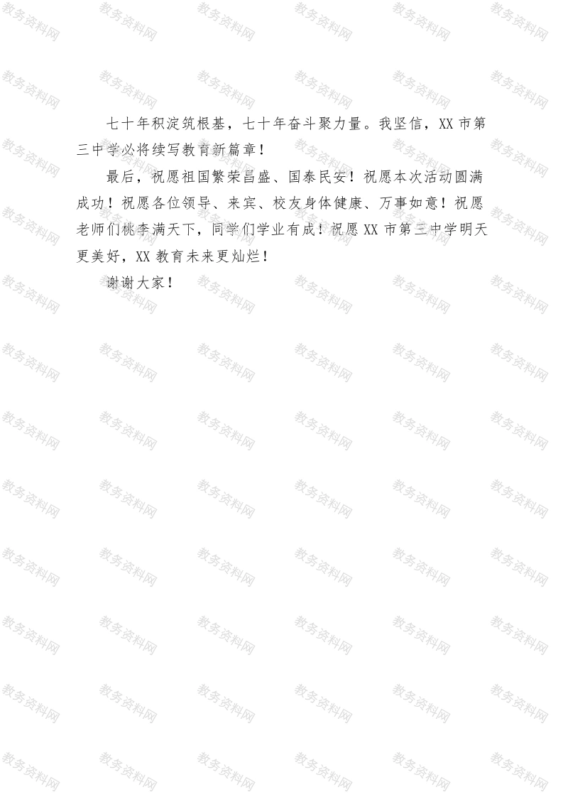 教育局副局长在Xx市第X中学建校七十周年庆祝大会上的发言尊敬的各位领导、各位嘉宾,亲爱的校友们、老师们、同学们:大家上午好!今年是中华人民共和国成立76周年,我们欢聚XX市第三中学,共庆“校友回湘”暨建校70周年办学成果展示活动。在此,我谨代表XX市教育局,向莅临盛会的领导、嘉宾、校友,致以最热烈的欢迎!向全校师生员工,致以诚挚的问候!向七十载耕耘一线的三中教职员工,致以崇高敬意!向关心支持XX教育与三中发展的各界朋友,致以衷心感谢!七十六载祖国辉煌前行,七十载三中薪火相传。学校始终紧跟时代步伐,牢记“为党育人、为国育才”使命,贯彻党的教育方针,形成理念清晰、管理科学、特色鲜明的办学格局,为XX教育发展注入动力,向社会输送了大批优秀人才,诠释了基础教育的责任担当。今天的活动,是三中七十年办学的总结,更是新征程的起点。希望三中以此次活动为契机,紧扣“教书育人”核心,以发展为主题、质量为根本、创新为动力,深化改革、优化育人环境,力争成为XX基础教育标杆;希望广大校友心系母校,常回家看看,为学校建设建言献策,添砖加瓦;期盼社会各界持续关心支持教育,为XX教育发展创造更好环境。