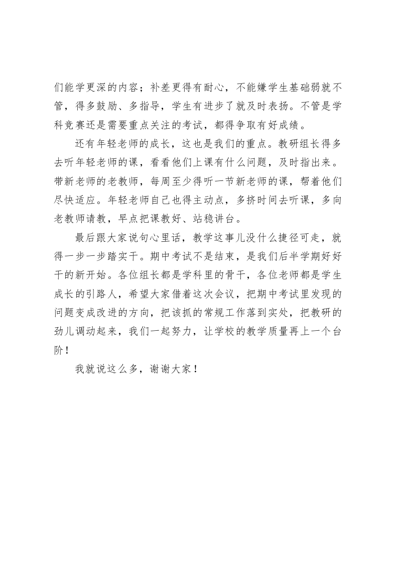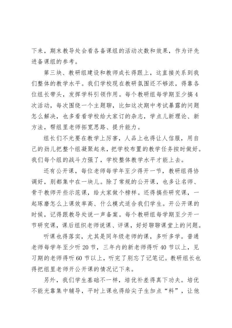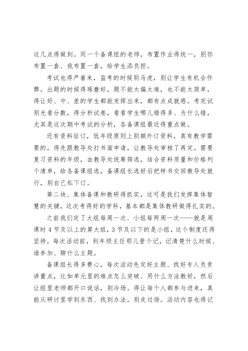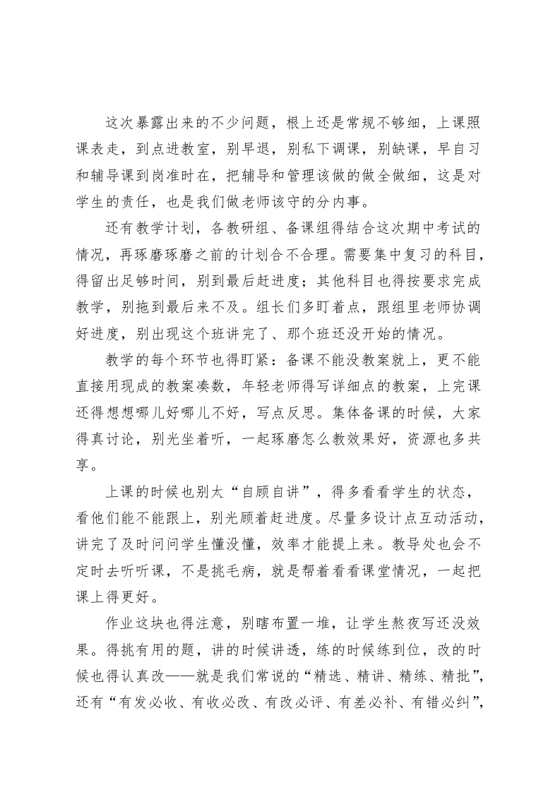 期中考试复盘后,校长在教研组长和备课组长会议上讲话:教学别搞“花架子”,抓实这3点准没错各位老师、各位组长:今天下午这个时间把把大家请到一起,期中考试刚过去不久,这事不止是看前半学期我们教得怎样、学生学得怎样,更像让我们回头照一照镜子,哪块做得结实、哪块要补,教研组和备课组想把工作面对面谈一谈,全校老师也把后半学期的安排说清楚。刚才成绩摆在那,不少班级不少学科这次拿出来的答卷不错,背后就是老师们守着课、把学生带着走的那股劲,我代表学校向在一线把课堂撑起来的每一位老师表达感谢。从这次考试中,我们可以看出很多问题,有的学科课堂里推进不够紧,讲得多学生没咽下去,有的班在不同基础的学生面前拿法子不够细,高水平的学生吃不饱,基础薄的跟不上,备课组一起磨课的力道没显现出来,还是各自拿各自的方案,这些点要盯住,学校学生基础在那摆着,花样不顶用,脚踏实地把份内事一件件做实,学生的进步才看得见,教学质量才会上去。后面的工作分三块跟大家把重点拎出来,请组长带头往前推动,需要全体老师一起配合。第一块就是教学常规抓牢,这是出成绩的底子也是底线。