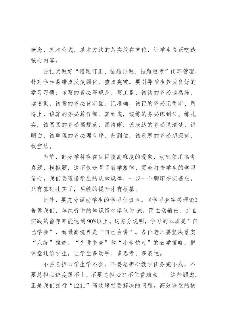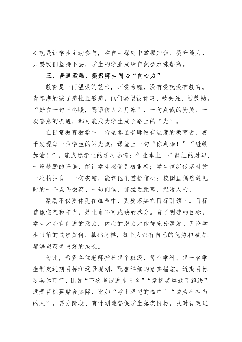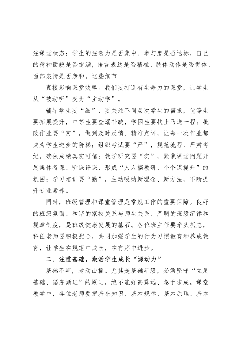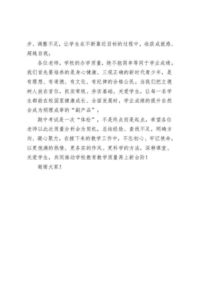 期中考试后质量分析会,校长总结发言:抓实常规、夯实基础、关爱学生各位老师:大家下午好!期中考试已顺利落幕,今天我们齐聚一堂召开质量分析会,核心目的是立足学期中段的教学节点,全面复盘各班级、各学科的教学成效,精准查找教与学中的优势与不足,进而明确后续努力方向一一让每一位老师都能找准教学发力点,让每一名学生都能找到成长突破口,真正实现“以考促教、以考促学”的良性循环。刚才教务处已通报了整体考试情况,数据客观反映了我们的教学现状。成绩值得肯定的同时,更要清醒看到存在的问题。结合本次考试反馈,我对下一阶段教学工作提三点建议,与大家共勉:一、抓实常规,筑牢教学质量“压舱石”教学常规是教育教学的根本所在,是保障质量稳定的核心支撑,必须持之以恒、抓细抓实。“备、教、辅、改、考、研、习”这七个环节,环环相扣、缺一不可,是我们每一位教师的基本功。备课教研要“深”,要立足学情、吃透教材,把准重难点和考点,杜绝“照本宣科”;课堂教学要“活”,积极推行小组合作探究模式,让课堂真正“动”起来。各位老师要时刻关