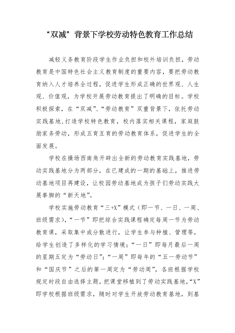 “双减”背景下学校劳动特色教育工作总结减轻义务教育阶段学生作业负担和校外培训负担,劳动教育是中国特色社会主义教育制度的重要内容,要把劳动教育纳入人才培养全过程,促进学生形成正确的世界观、人生观、价值观,为学校开展劳动教育提出了明确的目标。学校积极探索,在“双减”、“劳动教育”双重背景下,依托劳动实践基地,打造学校特色教育,校内落实相关课程,家庭鼓励家务劳动,形成五育互育的劳动教育体系,促进学生的全面发展。学校在操场西南角开辟出全新的劳动教育实践基地,劳动实践基地分为两部分,在已建成的一期的基础上,推进劳动基地项目再建设,让校园劳动基地成为孩子们劳动实践大展拳脚的“新天地”。学校实施劳动教育“三+X”模式(即一节、一日、一周、班级需求),“一节”即把综合实践课程确定每周一节为劳动教育课,采取集中或分散进行,让学生参与种植、管理等,给学生创造了多样化的学习情境;“一日”即每月最后一周的星期五定为“劳动日”;“一周”即每年的“五一劳动节”和“国庆节”之后的第一周定为“劳动周”,各班根据学校规定时段自由选择主题,把课堂移植到了劳动实践基地,“X”即学校根据班级需求,随时对学生开放劳动教育基地,到基