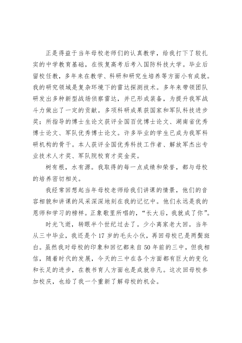 校友在Xx市第X中学建校七十周年庆祝大会上的发言:七秩薪火传使命一生科研强国防尊敬的母校领导,各位老师,各位校友,各位同学们:大家好!在这美好的时刻,我们迎来了母校成立七十周年的校庆。受母校的邀请,在毕业50年后回来参加校庆活动,倍感荣幸。七十年来,三中一代又一代的老师在三尺讲台上,沤心沥血,辛勤耕耘。培养出大批优秀的青年学子,他们从这里起航,奔赴祖国的大江南北,用自己的聪明才智和青春年华为国家建设做出了自己的贡献,也为母校争得了荣光。中学阶段是人生中至关重要的一个阶段,在这个阶段,我们由少年成长为青年,由幼稚走向成熟,世界观也在此阶段形成。能进入一所好中学读书乃人生之大幸。三中就是这样的好中学。我是1971年入读三中,在这里度过了四年的中学时光。初中是在99班,高中是42班。当时全国还处于十年动乱时期,教育领域更是重灾区。整个教育体系都处于不正常状态:学制被压缩,课程内容被删减,还要去学工学农,进一步挤压了课堂授课的时间。高考也被取消,上大学无望。在这样的大环境下,三中依然能维持正常的教学秩序,保持高水准的教学质量。老师讲课、批改作业和考试,每个环节都一丝不苟,严格要求。